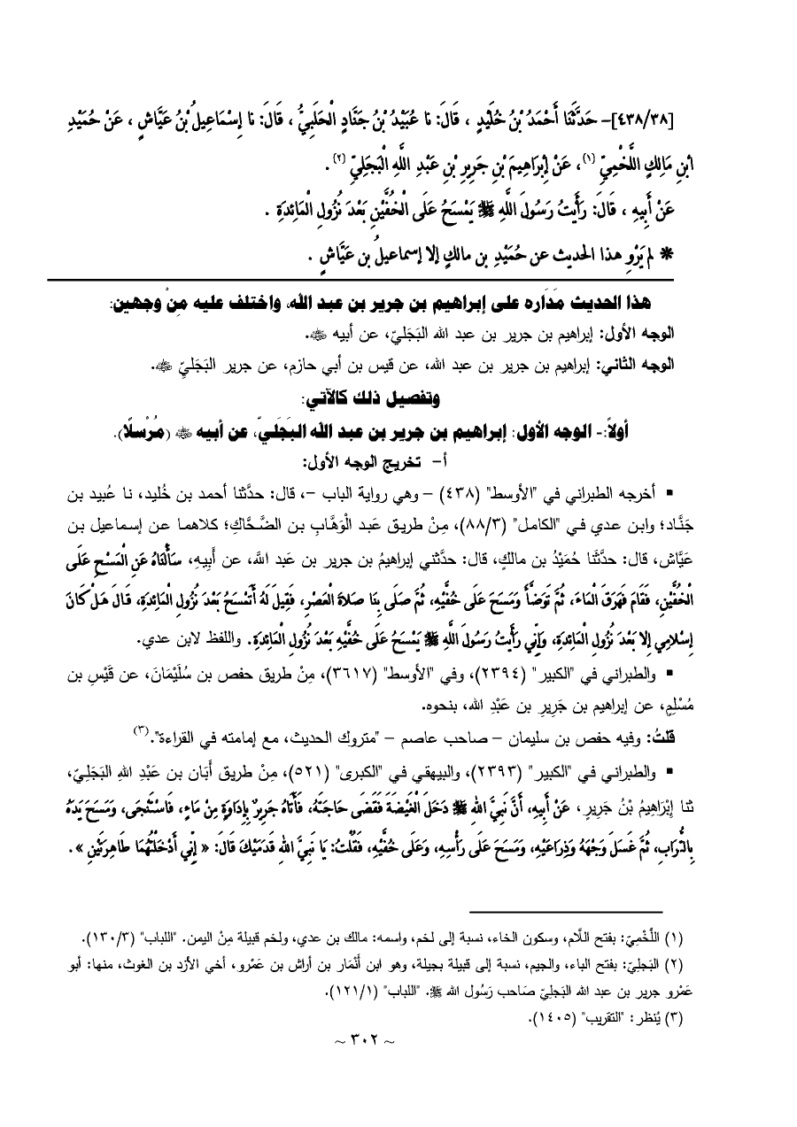 • أخرجه الطبراني في "الأوسط" (٤٣٨) - وهي رواية الباب -، قال: حدَّثنا أحمد بن خُليد، نا عُبيد بن جَنَّاد؛ وابن عدي في "الكامل" (٣/ ٨٨)، مِنْ طريق عَبد الْوَهَّابِ بن الضَّحَّاكِ؛ كلاهما عن إسماعيل بن عَيَّاش، قال: حدَّثَنا حُمَيْدُ بن مالكٍ، قال: حدَّثني إبراهيمُ بن جرير بن عَبد اللَّه، عن أَبِيهِ، سَأَلْنَاهُ عَنِ الْمَسْحِ عَلَى الْخُفَّيْنِ، فَقَامَ فَهَرَقَ الْمَاءَ، ثُمَّ تَوَضَّأَ وَمَسَحَ عَلَى خُفَّيْهِ، ثُمَّ صَلَى بِنَا صَلاةَ الْعَصْرِ، فَقِيلَ لَهُ أَتَمْسَحُ بَعْدَ نُزُولِ الْمَائِدَةِ، قَالَ هَلْ كَانَ إِسْلامِي إِلا بَعْدَ نُزُولِ الْمَائِدَةِ، وَإِنِّي رَأَيْتُ رَسُولَ اللَّهِ - صلى الله عليه وسلم - يَمْسَحُ عَلَى خُفَّيْهِ بَعْدَ نُزُولِ الْمَائِدَةِ. واللفظ لابن عدي.
