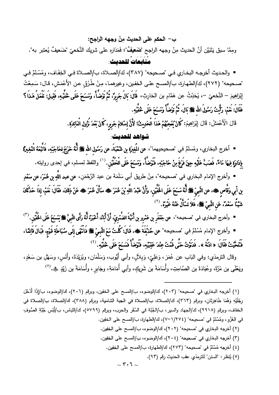 • والحديث أخرجه البخاري في "صحيحه" (٣٨٧)، ك/الصلاة، ب/الصلاة في الخِفَاف، ومُسْلمٌ في "صحيحه" (٢٧٢)، ك/الطهارة، ب/المسح على الخفين، وغيرهما، مِنْ طُرُقٍ عن الأَعْمَشِ، قال: سَمِعْتُ إِبْرَاهِيمَ - النَّخعيّ -، يُحَدِّثُ عن هَمَّامِ بن الحَارِثِ، قَالَ: بَالَ جَرِيرٌ، ثُمَّ تَوَضَّأَ، وَمَسَحَ عَلَى خُفَّيْهِ، فَقِيلَ: تَفْعَلُ هَذَا؟ فَقَالَ: نَعَمْ، رَأَيْتُ رَسُولَ اللهِ - صلى الله عليه وسلم - بَالَ، ثُمَّ تَوَضَّأَ وَمَسَحَ عَلَى خُفَّيْهِ.