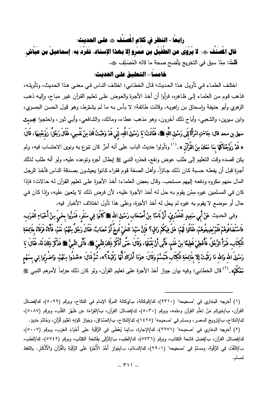 (¬٢) أخرجه البخاري في "صحيحه" (٢٢٧٦)، ك/الإجارة، ب/مَا يُعْطَى في الرُّقْيَةِ على أَحْيَاءِ العَرَبِ، وبرقم (٥٠٠٧)، ك/فضائل القرآن، ب/فضل فاتحة الكتاب، وبرقم (٥٧٣٦)، ك/الطب، ب/الرُّقَى بِفَاتِحَةِ الكِتَابِ، وبرقم (٥٧٤٩)، ك/الطب، ب/النَّفْثِ فِي الرُّقْيَةِ، ومسلمٌ في "صحيحه" (٢٢٠١)، ك/السلام، ب/جَوَازِ أَخْذِ الْأُجْرَةِ عَلَى الرُّقْيَةِ بِالْقُرْآنِ وَالْأَذْكَارِ. واللفظ لمسلم.