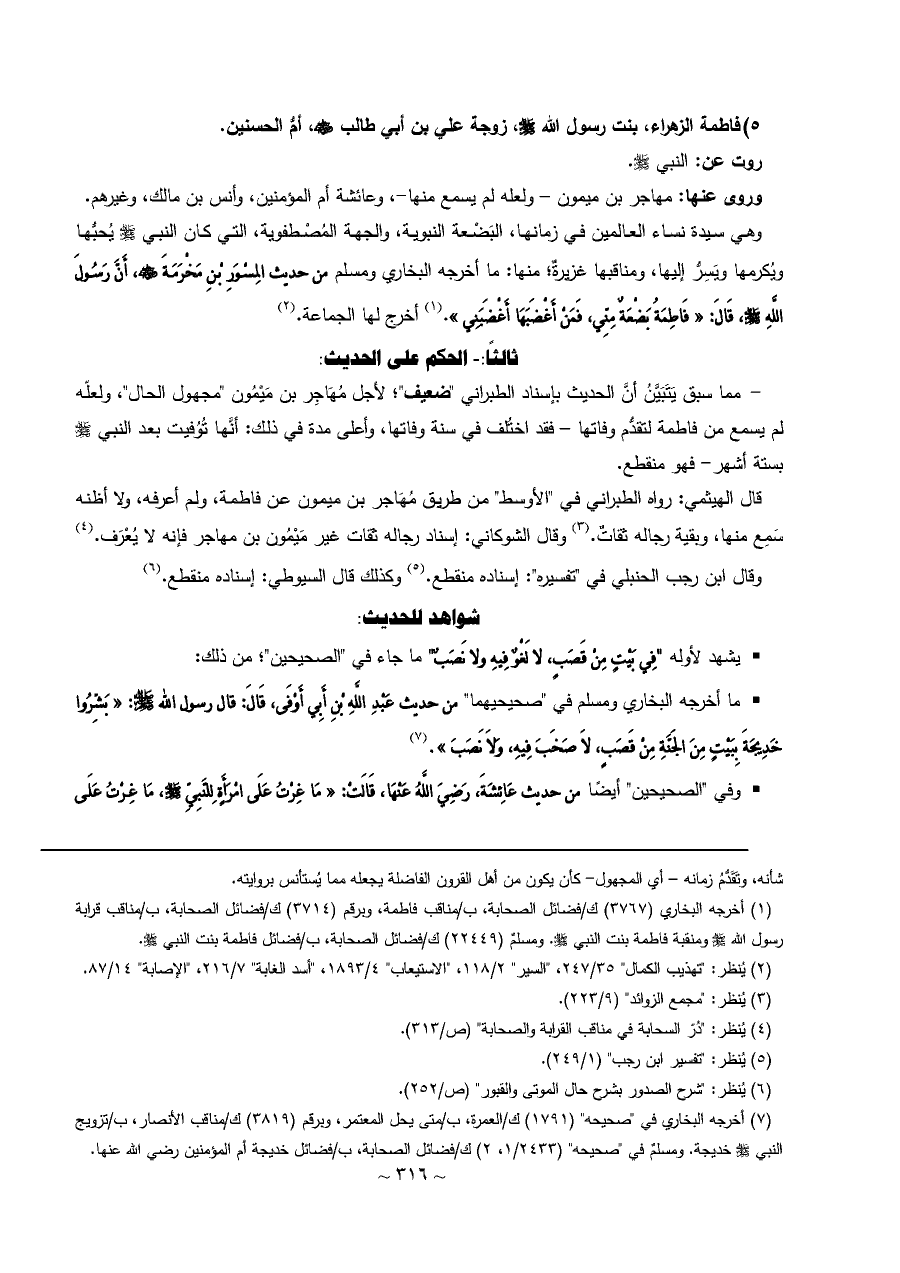 (¬١) أخرجه البخاري (٣٧٦٧) ك/فضائل الصحابة، ب/مناقب فاطمة، وبرقم (٣٧١٤) ك/فضائل الصحابة، ب/مناقب قرابة رسول الله - صلى الله عليه وسلم - ومنقبة فاطمة بنت النبي - صلى الله عليه وسلم -. ومسلمٌ (٢٢٤٤٩) ك/فضائل الصحابة، ب/فضائل فاطمة بنت النبي - صلى الله عليه وسلم -.