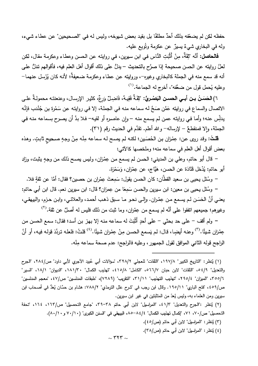 - وسُئل يحيى بن معين: ابن سيرين والحسن سَمِعَا من عِمرَان؟ قال: ابن سيرين نعم. قال ابن أبي حاتم: يعني أنَّ الحَسَن لم يسمع من عِمْران. وإلى نحو ما سبق ذهب أحمد، والعلائي، وابن حزم، والبيهقي، وغيرهم؛ جميعهم اتفقوا على أنَّه لم يسمع من عِمْران، وما ثبت من ذلك فليس له أصلٌ عن ثقة. (¬٢)
