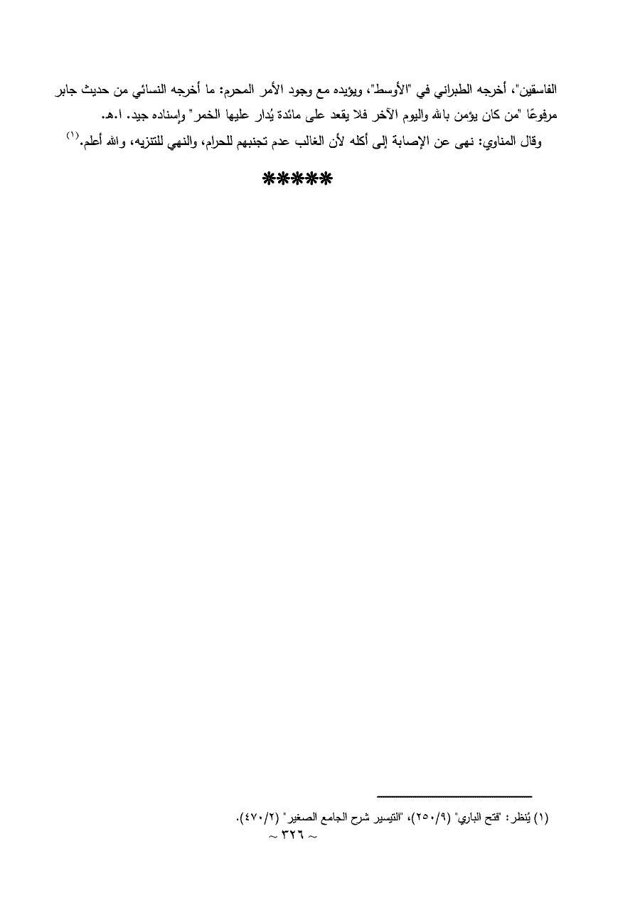 الفاسقين"، أخرجه الطبراني في "الأوسط"، ويؤيده مع وجود الأمر المحرم: ما أخرجه النسائي من حديث جابر مرفوعًا "من كان يؤمن بالله واليوم الآخر فلا يقعد على مائدة يُدار عليها الخمر" وإسناده جيد. ا. هـ.