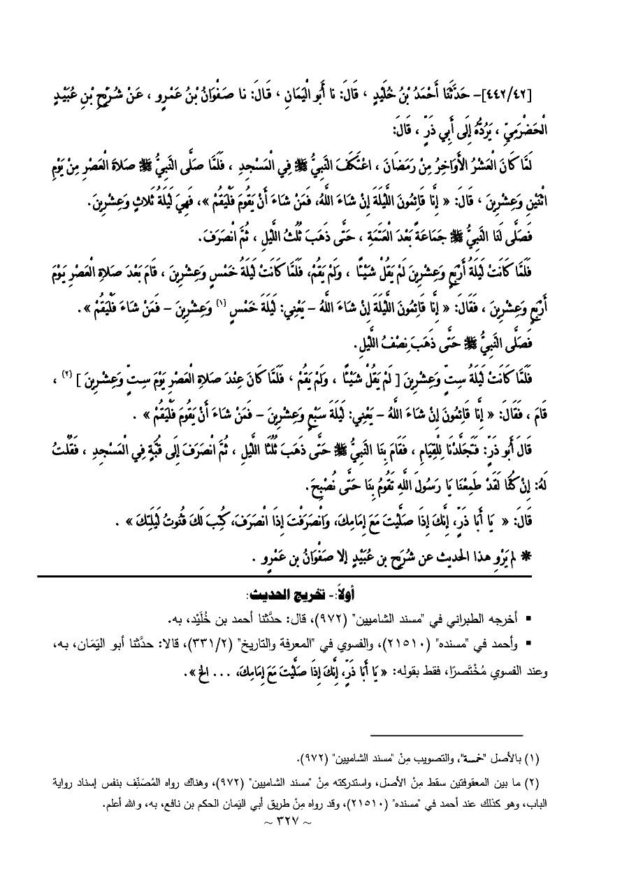 [٤٢/ ٤٤٢]- حَدَّثَنَا أَحْمَدُ بْنُ خُلَيْدٍ، قَالَ: نا أَبُو الْيَمَانِ، قَالَ: نا صَفْوَانُ بْنُ عَمْرٍو، عَنْ شُرَيْحِ بْنِ عُبَيْدٍ الْحَضْرَمِيِّ، يَرُدُّهُ إِلَى أَبِي ذَرٍّ، قَالَ: