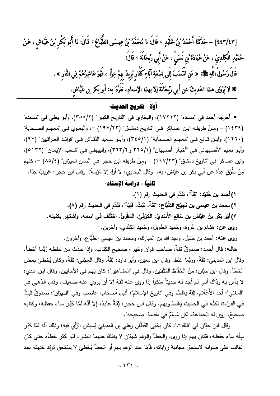 • أخرجه أحمد في "مسنده" (١٧٢١٢)، والبخاري في "التاريخ الكبير" (٢/ ٣٥٥)، وأبو يعلى في "مسنده" (١٤٣٩) - ومِنْ طريقه ابن عساكر في "تاريخ دمشق" (٢٣/ ١٩٧) -، والبغوي في "معجم الصحابة" (١٢٦٠)، وابن قانع في "معجم الصحابة" (١/ ٣٤٥)، وأبو سعيد النَّقاش في "فوائد العراقيين" (٩٧)، ... وأبو نُعيم الأصبهاني في "أخبار أصبهان" (١/ ٣٢٥ و ٢/ ٣٦٣)، والبيهقي في "شعب الإيمان" (٥١٣٢)، وابن عساكر في "تاريخ دمشق" (٢٣/ ١٩٧) - ومِنْ طريقه ابن حجر في "لسان الميزان" (٤/ ٨٥) -، كلهم مِنْ طُرُقٍ عِدَّة عن أبي بكر بن عَيَّاش، به. وقال البخاري: لا أراه إلا مُرْسلًا. وقال ابن حجر: غريبٌ جدًا.