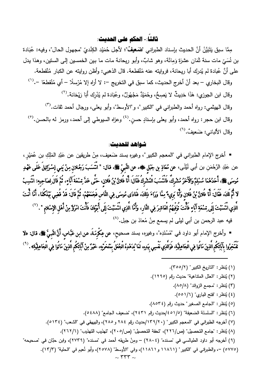 • أخرج الإمام الطبراني في "المعجم الكبير"، وغيره بسند ضَعيف، مِنْ طريقين عن عَبْدِ المَلِكِ بن عُمَيْرٍ، عن عَبْدِ الرَّحْمَنِ بن أبي لَيْلَى، عن مُعَاذِ بن جَبَلٍ - رضي الله عنه -، عن النَّبِيِّ - صلى الله عليه وسلم -، قال: " انْتَسَبَ رَجُلانِ مِنْ بَنِي إِسْرَائِيلَ عَلَى عَهْدِ مُوسَى - صلى الله عليه وسلم -، أَحَدُهُمَا مُسْلِمٌ وَالآخَرُ مُشْرِكٌ، فَانْتَسَبَ الْمُشْرِكُ فَقَالَ: أَنَا فُلانُ بْنُ فُلانٍ، حَتَّى عَدَّ تِسْعَةَ آبَاءٍ، ثُمَّ قَالَ لِصَاحِبِهِ: انْتَسِبْ لا أُمَّ لَكَ، فَقَالَ: أَنَا فُلانُ بْنُ فُلانٍ وَأَنَا بَرِيءٌ مِمَّا وَرَاءَ ذَلِكَ، فَنَادَى مُوسَى فِي النَّاسِ فَجَمَعَهُمْ، ثُمَّ قَالَ: قَدْ قُضِي بَيْنَكُمَا، أَمَّا أَنْتَ الَّذِي انْتَسَبْتَ إِلَى تِسْعَةِ آبَاءٍ فَأَنْتَ تُوَفِّيهُمُ الْعَاشِرَ فِي النَّارِ، وَأَمَّا الَّذِي انْتَسَبْتَ إِلَى أَبَوَيْكَ فَأَنْتَ امْرُؤٌ مِنْ أَهْلِ الإِسْلامِ ". (¬٧)