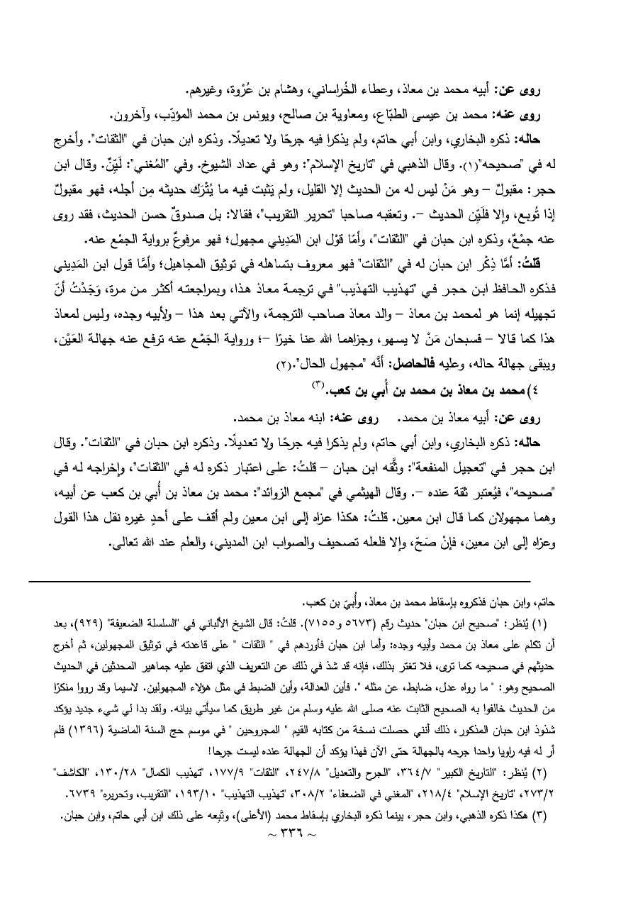 قلتُ: أمَّا ذِكْر ابن حبان له في "الثقات" فهو معروف بتساهله في توثيق المجاهيل؛ وأمَّا قول ابن المَدِيني فذكره الحافظ ابن حجر في "تهذيب التهذيب" في ترجمة معاذ هذا، وبمراجعته أكثر من مرة، وَجَدْتُ أنّ تجهيله إنما هو لمحمد بن معاذ - والد معاذ صاحب الترجمة، والآتي بعد هذا - ولأبيه وجده، وليس لمعاذ هذا كما قالا - فسبحان مَنْ لا يسهو، وجزاهما الله عنا خيرًا -؛ ورواية الجَمْع عنه ترفع عنه جهالة العَيْن، ويبقى جهالة حاله، وعليه فالحاصل: أنَّه "مجهول الحال". (¬٢)