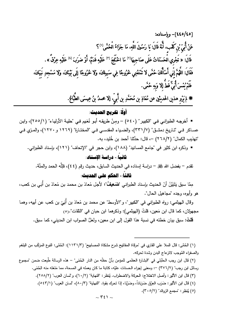 وقال الهيثمي: رواه الطبراني في "الكبير"، و"الأوسط" عن محمد بن مُعاذ بن أُبَيّ بن كعب عن أبيه، وهما مجهولان، كما قال ابن مَعين، قلتُ (الهيثمي): وذكرهما ابن حبان في "الثقات". (¬٥)