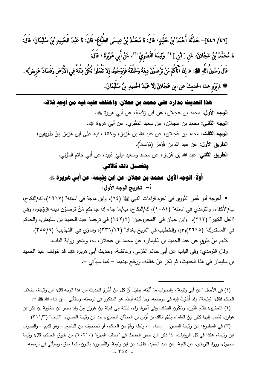 [٤٦/ ٤٤٦]- حَدَّثَنَا أَحْمَدُ بْنُ خُلَيْدٍ، قَالَ: نا مُحَمَّدُ بْنُ عِيسَى الطَّبَّاعُ، قَالَ: نا عَبْدُ الْحَمِيدِ بْنُ سُلَيْمَانَ، قَالَ: نا مُحَمَّدُ بْنُ عَجْلانَ، عَنِ [ابْنِ] (¬١) وَثِيمَةَ النَّصْرِيِّ (¬٢)، عَنْ أَبِي هُرَيْرَةَ، قَالَ: