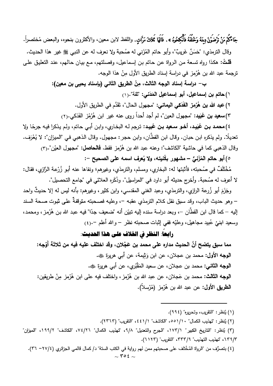 قلتُ: هكذا رواه تسعة من الرواة عن حاتم بن إسماعيل، وفصلتهم، مع بيان حالهم، عند التعليق على ترجمة عبد الله بن هُرْمز في دراسة إسناد الطريق الأول مِنْ هذا الوجه.