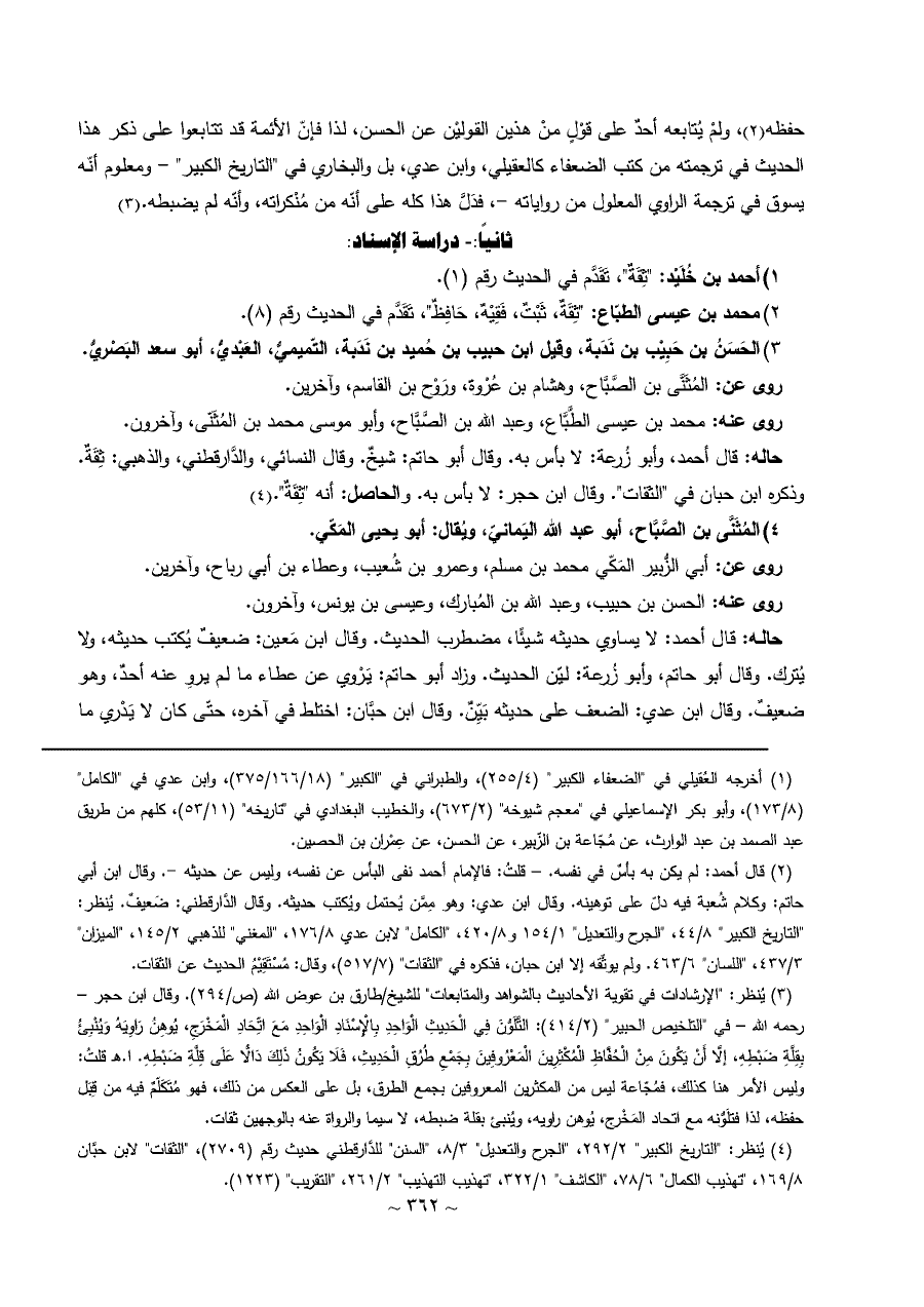 حفظه (¬١)، ولمْ يُتابعه أحدٌ على قوْلٍ منْ هذين القوليْن عن الحسن، لذا فإنّ الأئمة قد تتابعوا على ذكر هذا الحديث في ترجمته من كتب الضعفاء كالعقيلي، وابن عدي، بل والبخاري في "التاريخ الكبير" - ومعلوم أنّه يسوق في ترجمة الراوي المعلول من رواياته -، فدَلَّ هذا كله على أنّه من مُنْكراته، وأنّه لم يضبطه. (¬٢)