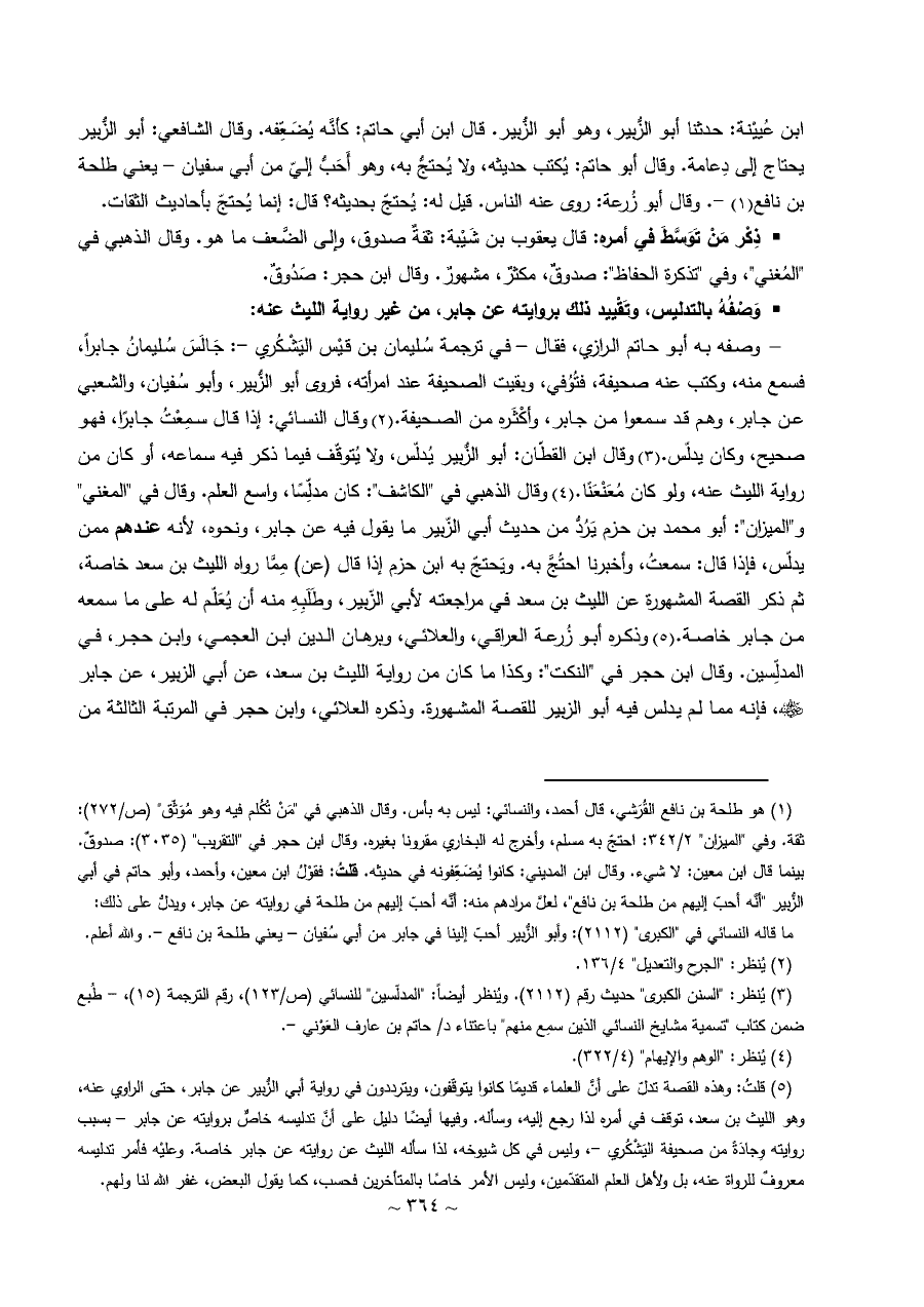 (¬٥) قلتُ: وهذه القصة تدلّ على أنَّ العلماء قديمًا كانوا يتوقّفون، ويترددون في رواية أبي الزُّبير عن جابر، حتى الراوي عنه، وهو الليث بن سعد، توقف في أمره لذا رجع إليه، وسأله. وفيها أيضًا دليل على أنَّ تدليسه خاصٌّ بروايته عن جابر - بسبب روايته وِجادَةً من صحيفة اليَشْكُري -، وليس في كل شيوخه، لذا سأله الليث عن روايته عن جابر خاصة. وعليْه فأمر تدليسه معروفٌ للرواة عنه، بل ولأهل العلم المتقدّمين، وليس الأمر خاصًا بالمتأخرين فحسب، كما يقول البعض، غفر الله لنا ولهم ..