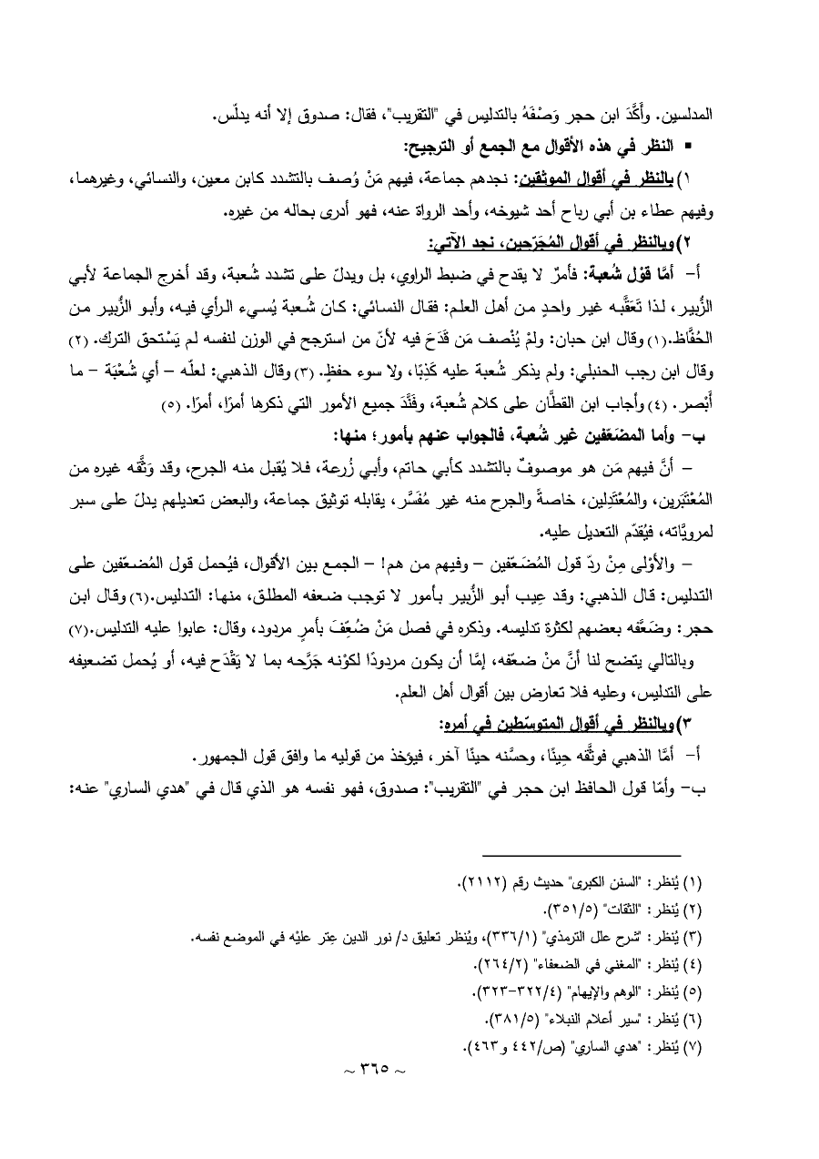 - والأوْلى مِنْ ردّ قول المُضَعّفين - وفيهم من هم! - الجمع بين الأقوال، فيُحمل قول المُضعّفين على التدليس: قال الذهبي: وقد عِيب أبو الزُّبير بأمور لا توجب ضعفه المطلق، منها: التدليس. (¬٦) وقال ابن حجر: وضَعَّفه بعضهم لكثرة تدليسه. وذكره في فصل مَنْ ضُعِّفَ بأمرٍ مردود، وقال: عابوا عليه التدليس. (¬٧)