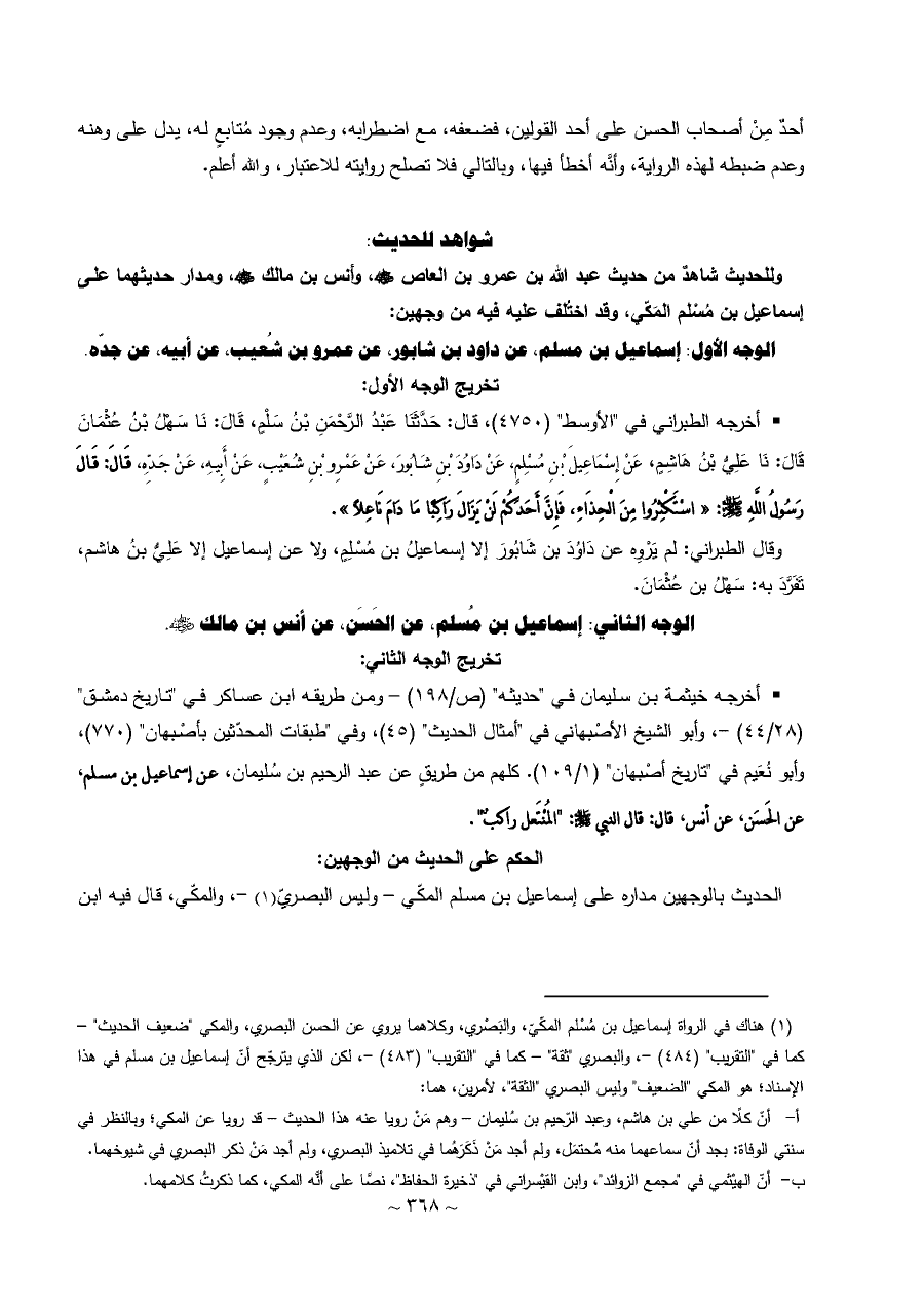 (¬١) هناك في الرواة إسماعيل بن مُسْلم المكّيّ، والبَصْري، وكلاهما يروي عن الحسن البصري، والمكي "ضعيف الحديث" - كما في "التقريب" (٤٨٤) -، والبصري "ثقة" - كما في "التقريب" (٤٨٣) -، لكن الذي يترجّح أنّ إسماعيل بن مسلم في هذا الإسناد؛ هو المكي "الضعيف" وليس البصري "الثقة"، لأمرين، هما: