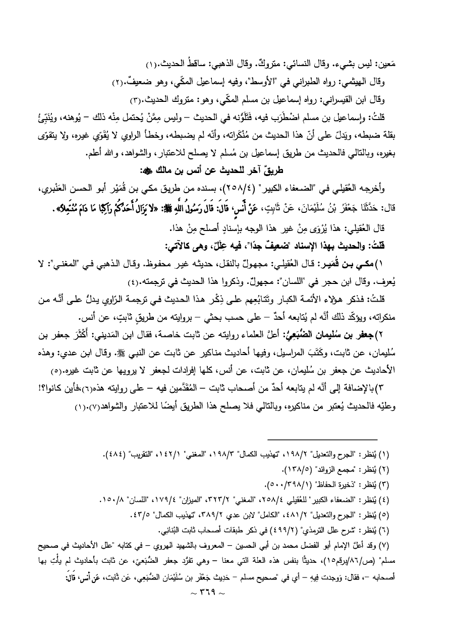 (¬٧) وقد أعلَّ الإمام أبو الفضل محمد بن أبي الحسين - المعروف بالشهيد الهروي - في كتابه "علل الأحاديث في صحيح مسلم" (ص/٨٦/برقم ١٥)، حديثًا بنفس هذه العلة التي معنا - وهي تفرُّد جعفر الضُّبَعيّ، عن ثابت بأحاديث لم يأْتِ بها أصحابه -، فقال: وَوجدت فِيهِ - أي في "صحيح مسلم - حَدِيث جَعْفَر بن سُلَيْمَان الضُّبَعِي، عَن ثَابت، عَن أنس، قَالَ: