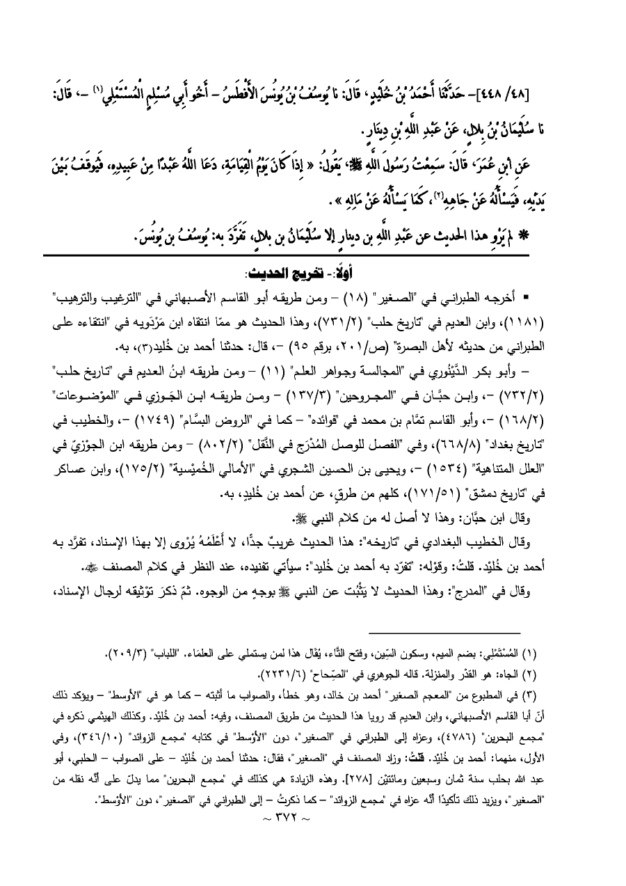 [٤٨/ ٤٤٨]- حَدَّثَنَا أَحْمَدُ بْنُ خُلَيْدٍ، قَالَ: نا يُوسُفُ بْنُ يُونُسَ الأَفْطَسُ - أَخُو أَبِي مُسْلِمٍ الْمُسْتَمْلِي (¬١) -، قَالَ: نا سُلَيْمَانُ بْنُ بِلالٍ، عَنْ عَبْدِ اللَّهِ بْنِ دِينَارٍ.