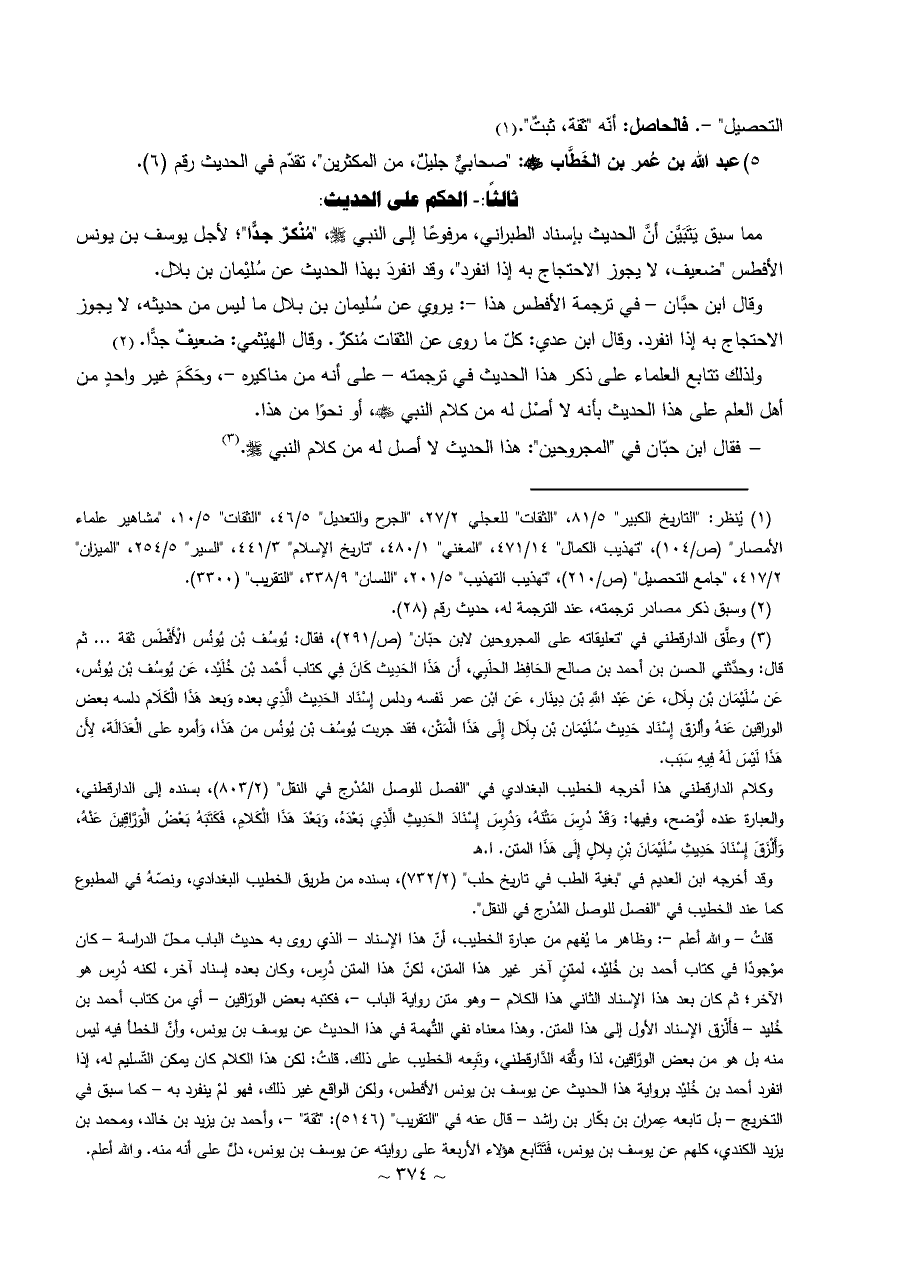 (¬٣) وعلَّق الدارقطني في "تعليقاته على المجروحين لابن حبّان" (ص/٢٩١)، فقال: يُوسُف بْن يُونُس الْأَفْطَس ثقة ... ثم قال: وحدَّثني الحسن بن أحمد بن صالح الحَافِظ الحلَبِي، أَن هَذَا الحَدِيث كَانَ فِي كتاب أَحْمد بْن خُلَيْد، عَن يُوسُف بْن يُونُس، عَن سُلَيْمَان بْن بِلَال، عَن عَبْد اللَّهِ بْن دِينَار، عَن ابْن عمر نَفسه ودلس إِسْنَاد الحَدِيث الَّذِي بعده وَبعد هَذَا الْكَلَام دلسه بعض الوراقين عَنهُ وألزق إِسْنَاد حَدِيث سُلَيْمَان بْن بِلَال إِلَى هَذَا الْمَتْن، فقد جربت يُوسُف بْن يُونُس من هَذَا، وَأمره على الْعَدَالَة، لِأَن هَذَا لَيْسَ لَهُ فِيهِ سَبَب.