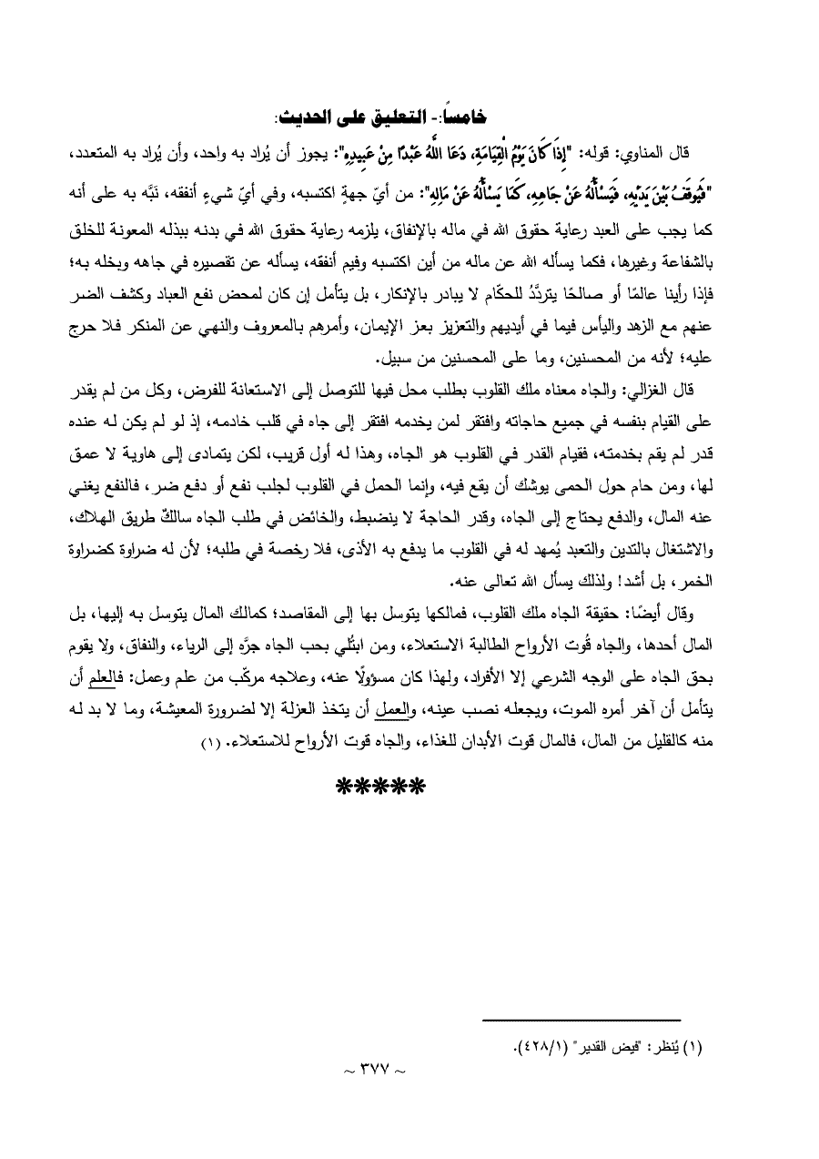 قال المناوي: قوله: "إِذَا كَانَ يَوْمُ الْقِيَامَةِ، دَعَا اللَّهُ عَبْدًا مِنْ عَبِيدِهِ": يجوز أن يُراد به واحد، وأن يُراد به المتعدد، "فَيُوقَفُ بَيْنَ يَدَيْهِ، فَيَسْأَلُهُ عَنْ جَاهِهِ، كَمَا يَسْأَلُهُ عَنْ مَالِهِ": من أيّ جهةٍ اكتسبه، وفي أيّ شيءٍ أنفقه، نَبَّه به على أنه كما يجب على العبد رعاية حقوق الله في ماله بالإنفاق، يلزمه رعاية حقوق الله في بدنه ببذله المعونة للخلق بالشفاعة وغيرها، فكما يسأله الله عن ماله من أين اكتسبه وفيم أنفقه، يسأله عن تقصيره في جاهه وبخله به؛ فإذا رأينا عالمًا أو صالحًا يتردَّدُ للحكّام لا يبادر بالإنكار، بل يتأمل إن كان لمحض نفع العباد وكشف الضر عنهم مع الزهد واليأس فيما في أيديهم والتعزيز بعز الإيمان، وأمرهم بالمعروف والنهي عن المنكر فلا حرج عليه؛ لأنه من المحسنين، وما على المحسنين من سبيل.