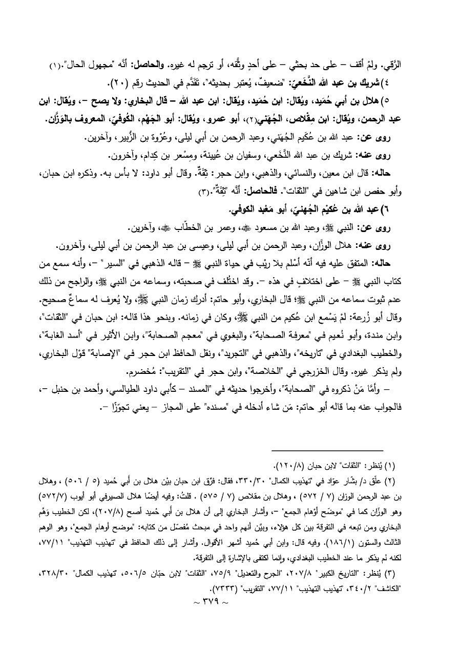 (¬٢) علّق د/ بشّار عوّاد في "تهذيب الكمال" ٣٠/ ٣٣٠، فقال: فرَّق ابن حبان بيْن هلال بن أَبي حُميد (٥/ ٥٠٦)، وهلال بن عبد الرحمن الوزان (٧/ ٥٧٢)، وهلال بن مقلاص (٧/ ٥٧٥). قلتُ: وفيه أيضًا هلال الصيرفي أبو أيوب (٧/ ٥٧٢) وهو الوزّان كما في "موضّح أوْهام الجمع" -، وأشار البخاري إلى أن هلال بن أَبي حُميد أصح (٨/ ٢٠٧)، لكن الخطيب وَهَّم البخاري ومن تبعه في التفرقة بين كل هؤلاء، وبيَّن أنهم واحد في مبحث مُفصّل من كتابه: "موضح أوهام الجمع"، وهو الوهم الثالث والستون (١/ ١٨٦). وفيه قال: وابن أبي حُميد أشهر الأقوال. وأشار إلى ذلك الحافظ في "تهذيب التهذيب" ١١/ ٧٧، لكنه لم يذكر ما عند الخطيب البغدادي، وإنما اكتفى بالإشارة إلى التفرقة.