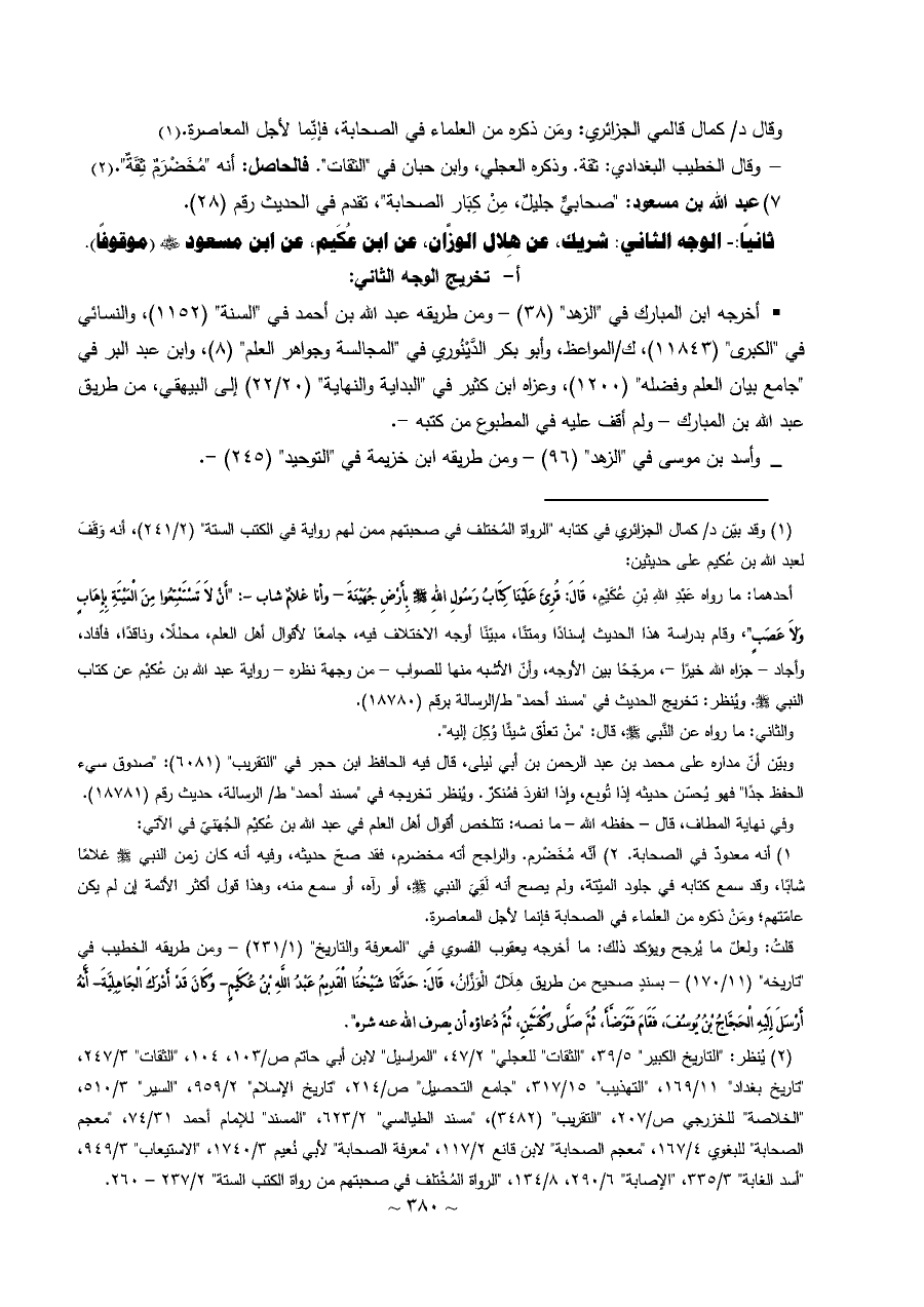 (¬١) وقد بيّن د/ كمال الجزائري في كتابه "الرواة المُختلف في صحبتهم ممن لهم رواية في الكتب الستة" (٢/ ٢٤١)، أنه وَقَفَ لعبد الله بن عُكيم على حديثين: