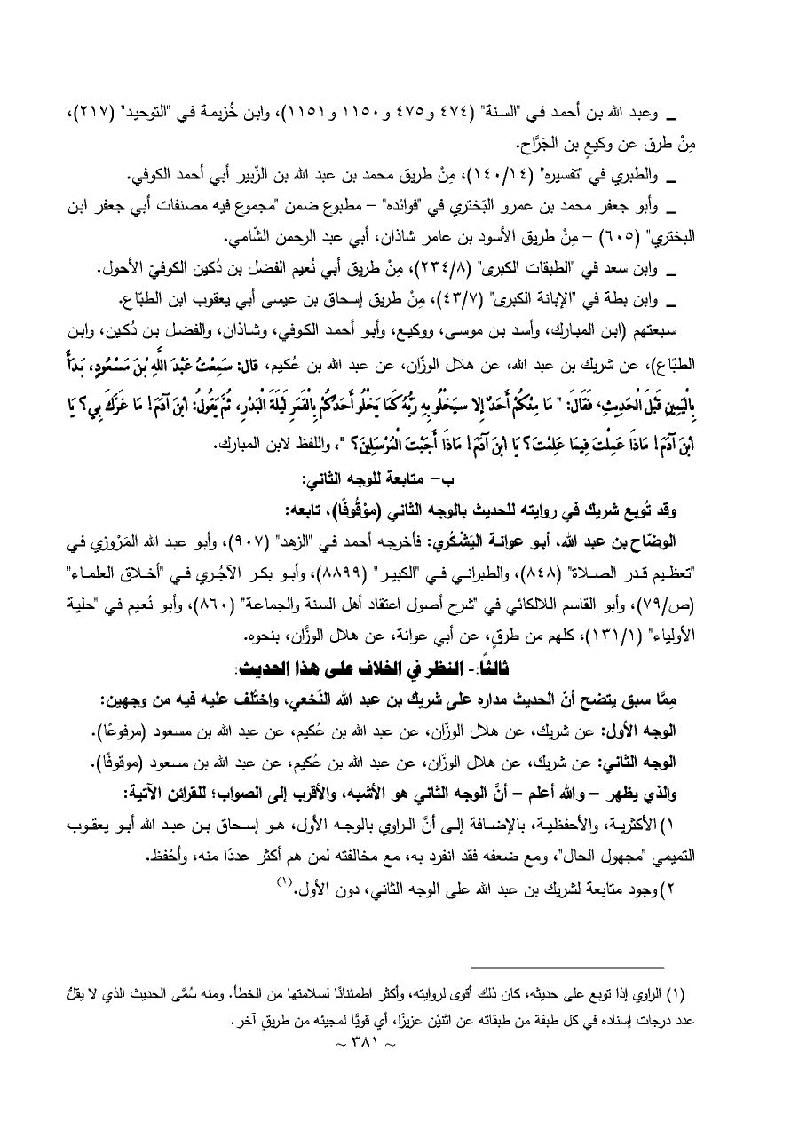 سبعتهم (ابن المبارك، وأسد بن موسى، ووكيع، وأبو أحمد الكوفي، وشاذان، والفضل بن دُكين، وابن الطبّاع)، عن شريك بن عبد الله، عن هلال الوزّان، عن عبد الله بن عُكيم، قال: سَمِعْتُ عَبْدَ اللَّهِ بْنَ مَسْعُودٍ، بَدَأَ بِالْيَمِينِ قَبْلَ الْحَدِيثِ، فَقَالَ: " مَا مِنْكُمْ أَحَدٌ إِلا سيَخْلُو بِهِ رَبُّهُ كَمَا يَخْلُو أَحَدُكُمْ بِالْقَمَرِ لَيْلَةَ الْبَدْرِ، ثُمَّ يَقُولُ: ابْنَ آدَمَ! مَا غَرَّكَ بِي؟ يَا ابْنَ آدَمَ! مَاذَا عَمِلْتَ فِيمَا عَلِمْتَ؟ يَا ابْنَ آدَمَ! مَاذَا أَجَبْتَ الْمُرْسَلِينَ؟ "، واللفظ لابن المبارك.