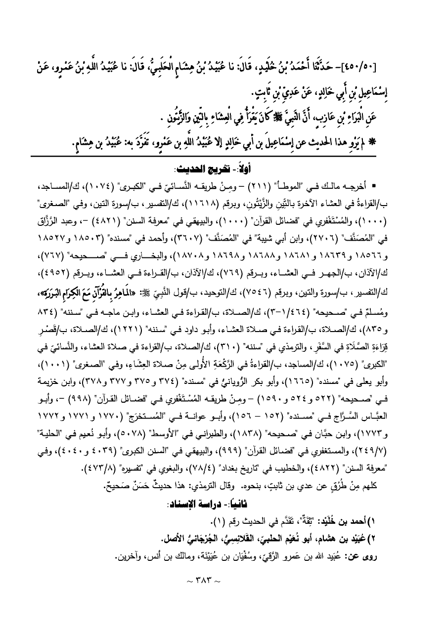 • أخرجه مالك في "الموطأ" (٢١١) - ومِنْ طريقه النَّسائيّ في "الكبرى" (١٠٧٤)، ك/المساجد، ب/القراءةُ في العشاء الآخرة بالتِّينِ والزَّيْتُونِ، وبرقم (١١٦١٨)، ك/التفسير، ب/سورة التين، وفي "الصغرى" (١٠٠٠)، والمُسْتَغْفري في "فضائل القرآن" (١٠٠٠)، والبيهقي في "معرفة السنن" (٤٨٢١) -، وعبد الرَّزَّاق في "المُصَنَّف" (٢٧٠٦)، وابن أبي شيبة" في "المُصَنَّف" (٣٦٠٧)، وأحمد في "مسنده" (١٨٥٠٣ و ١٨٥٢٧ و ١٨٥٦٦ و ١٨٦٣٩ و ١٨٦٨١ و ١٨٦٨٨ و ١٨٦٩٨ و ١٨٧٠٨)، والبخاري في "صحيحه" (٧٦٧)، ك/الآذان، ب/الجهر في العشاء، وبرقم (٧٦٩)، ك/الآذان، ب/القراءة في العشاء، وبرقم (٤٩٥٢)، ك/التفسير، ب/سورة والتين، وبرقم (٧٥٤٦)، ك/التوحيد، ب/قول النَّبِيِّ - صلى الله عليه وسلم -: «المَاهِرُ بِالقُرْآنِ مَعَ الكِرَامِ البَرَرَةِ»، ومُسلمٌ في "صحيحه" (٤٦٤/ ١ - ٣)، ك/الصلاة، ب/القراءة في العشاء، وابن ماجه في "سننه" (٨٣٤ و ٨٣٥)، ك/الصلاة، ب/القراءة في صلاة العشاء، وأبو داود في "سننه" (١٢٢١)، ك/الصلاة، ب/قَصْرِ قِرَاءَةِ الصَّلَاةِ في السَّفَرِ، والترمذي في "سننه" (٣١٠)، ك/الصلاة، ب/القراءة في صلاة العشاء، والنَّسائيّ في "الكبرى" (١٠٧٥)، ك/المساجد، ب/القراءةُ في الرَّكْعَةِ الأُولى مِنْ صلاة العِشَاءِ، وفي "الصغرى" (١٠٠١)، وأبو يعلى في "مسنده" (١٦٦٥)، وأبو بكر الرُّويانيُّ في "مسنده" (٣٧٤ و ٣٧٥ و ٣٧٧ و ٣٧٨)، وابن خزيمة في "صحيحه" (٥٢٢ و ٥٢٤ و ١٥٩٠) - ومِنْ طريقه المُسْتَغْفري في "فضائل القرآن" (٩٩٨) -، وأبو العبَّاس السَّرَّاج في "مسنده" (١٥٢ - ١٥٦)، وأبو عوانة في