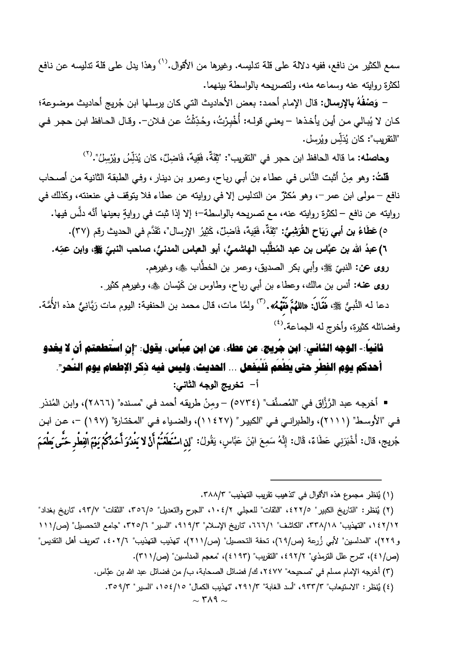 - وَصْفُهُ بالإرسال: قال الإمام أحمد: بعض الأحاديث التي كان يرسلها ابن جُريج أحاديث موضوعة؛ كان لا يُبالي من أين يأخذها - يعني قوله: أُخْبِرْتُ، وحُدِّثْتُ عن فلان-. وقال الحافظ ابن حجر في "التقريب": كان يُدَلِّس ويُرسل.