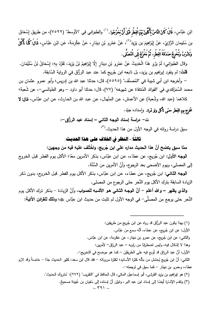 الوجه الثاني: ابن جُريج، عن عطاء، عن ابن عبَّاس، بذكر الأكل يوم الفطر قبل الخروج، بدون ذكر الزيادة السابقة بترك الأكل يوم النَّحر حتى الرجوع من المصلى.