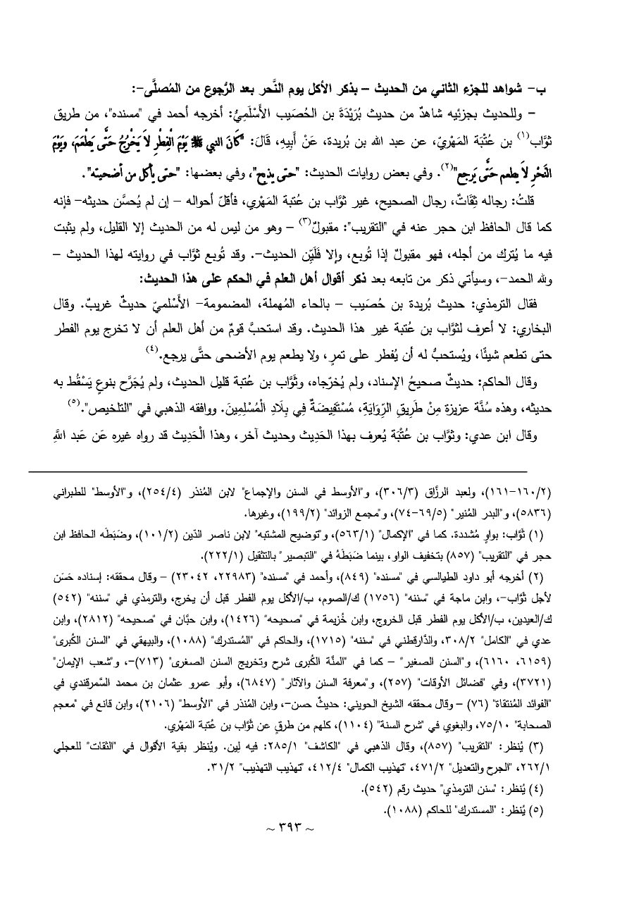 فقال الترمذي: حديث بُريدة بن حُصَيب - بالحاء المُهملة، المضمومة- الأَسْلميّ حديثٌ غريبٌ. وقال البخاري: لا أعرف لثوَّاب بن عُتبة غير هذا الحديث. وقد استحبَّ قومٌ من أهل العلم أن لا تخرج يوم الفطر حتى تطعم شيئًا، ويُستحبُّ له أن يُفطر على تمرٍ، ولا يطعم يوم الأضحى حتَّى يرجع. (¬٤)