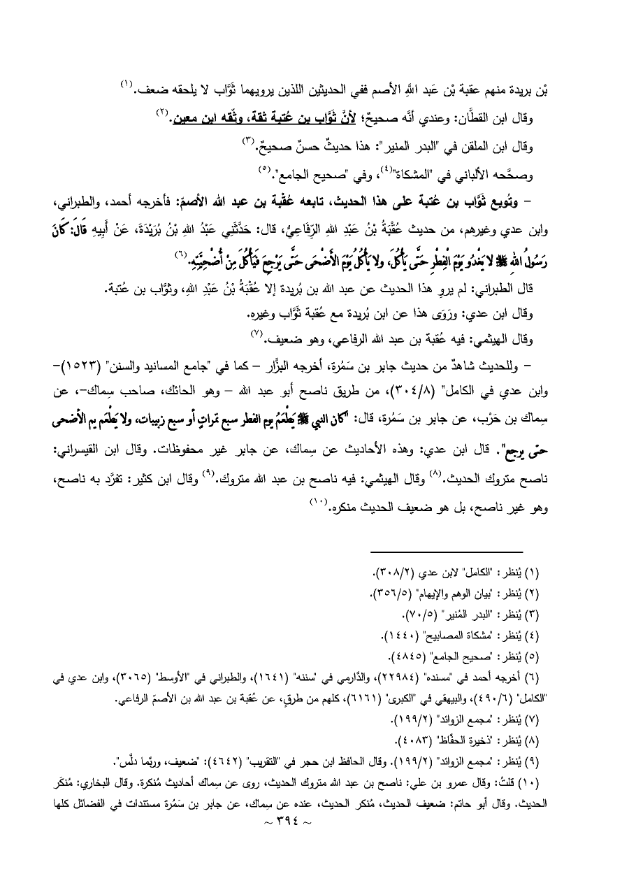- وللحديث شاهدٌ من حديث جابر بن سَمُرة، أخرجه البزَّار - كما في "جامع المسانيد والسنن" (١٥٢٣) - وابن عدي في الكامل" (٨/ ٣٠٤)، من طريق ناصح أبو عبد الله - وهو الحائك، صاحب سِماك-، عن سِماك بن حَرْب، عن جابر بن سَمُرة، قال: "كان النبي - صلى الله عليه وسلم - يَطْعَمُ يوم الفطر سبع تمراتٍ أو سبع زبيبات، ولا يَطْعَم يم الأضحى حتى يرجع". قال ابن عدي: وهذه الأحاديث عن سِماك، عن جابر غير محفوظات. وقال ابن القيسراني: ناصح متروك الحديث. (¬٨) وقال الهيثمي: فيه ناصح بن عبد الله متروك. (¬٩) وقال ابن كثير: تفرَّد به ناصح، وهو غير ناصح، بل هو ضعيف الحديث منكره. (¬١٠)