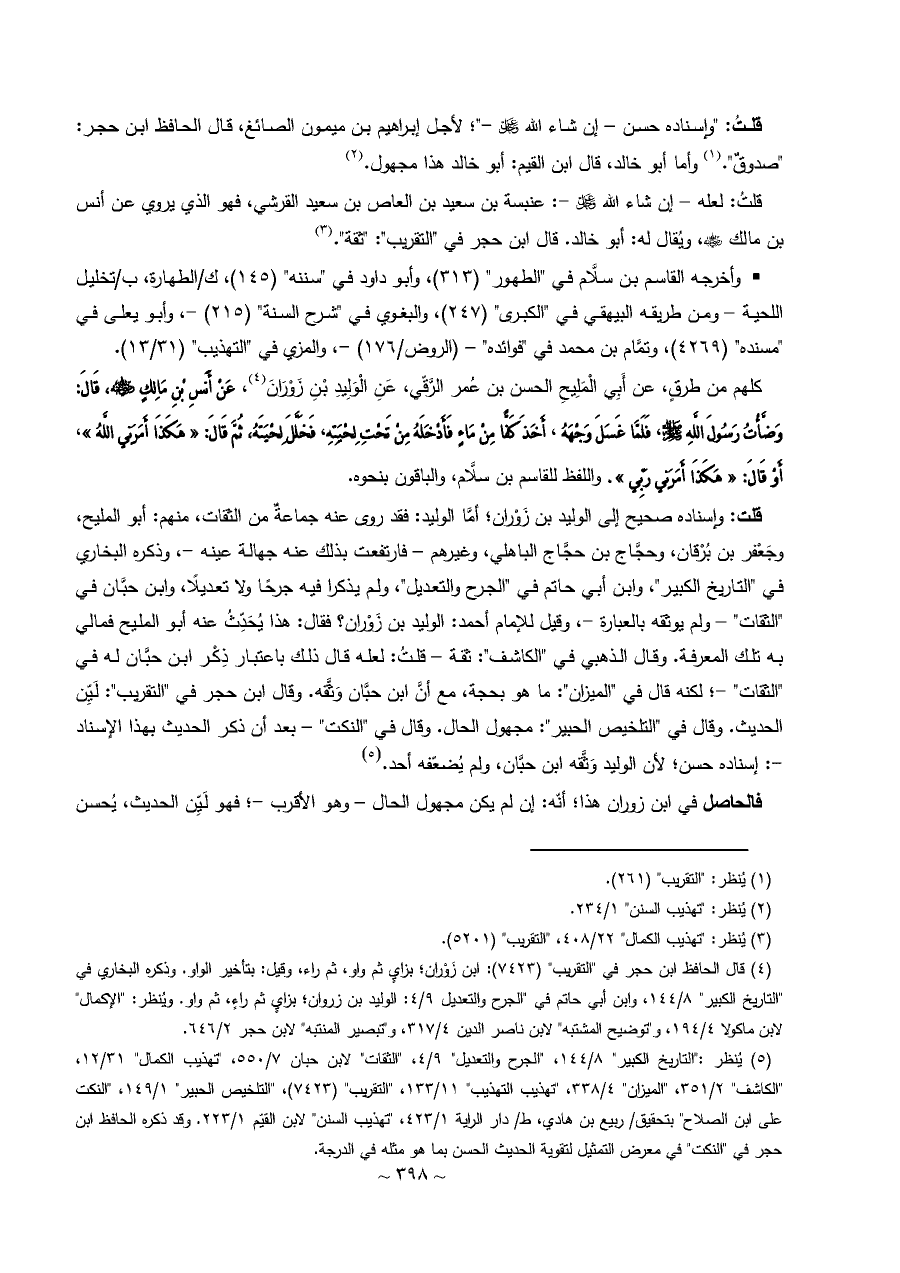 قلت: وإسناده صحيح إلى الوليد بن زَوْران؛ أمَّا الوليد: فقد روى عنه جماعةٌ من الثقات، منهم: أبو المليح، وجَعْفر بن بُرْقان، وحجَّاج بن حجَّاج الباهلي، وغيرهم - فارتفعت بذلك عنه جهالة عينه -، وذكره البخاري في "التاريخ الكبير"، وابن أبي حاتم في "الجرح والتعديل"، ولم يذكرا فيه جرحًا ولا تعديلًا، وابن حبَّان في "الثقات" - ولم يوثقه بالعبارة -، وقيل للإمام أحمد: الوليد بن زَوْران؟ فقال: هذا يُحَدِّثُ عنه أبو المليح فمالي به تلك المعرفة. وقال الذهبي في "الكاشف": ثقة - قلتُ: لعله قال ذلك باعتبار ذِكْر ابن حبَّان له في "الثقات" -؛ لكنه قال في "الميزان": ما هو بحجة، مع أنَّ ابن حبَّان وَثَّقه. وقال ابن حجر في "التقريب": لَيِّن الحديث. وقال في "التلخيص الحبير": مجهول الحال. وقال في "النكت" - بعد أن ذكر الحديث بهذا الإسناد -: إسناده حسن؛ لأن الوليد وَثَّقه ابن حبَّان، ولم يُضعّفه أحد. (¬٥)