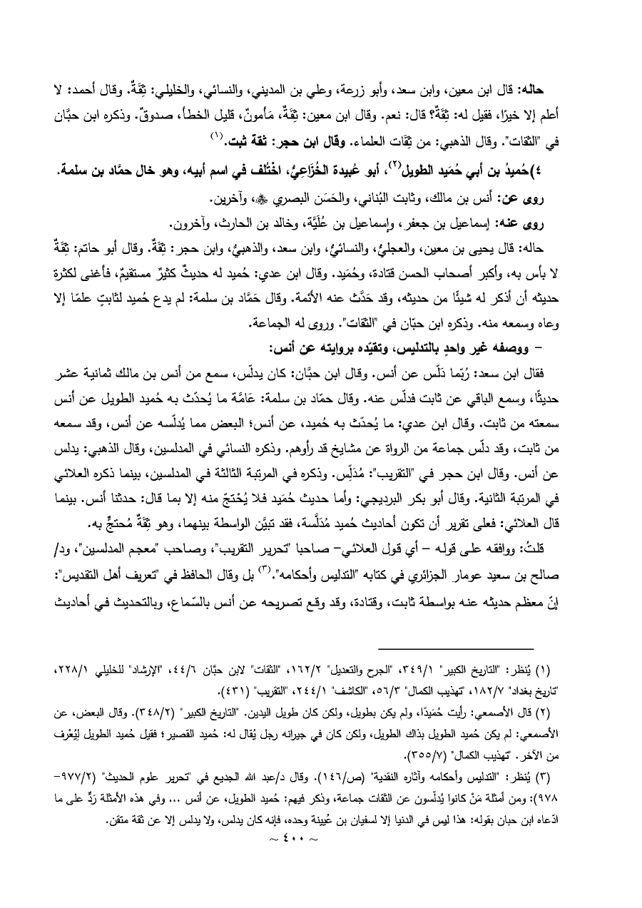 (¬٣) يُنظر: "التدليس وأحكامه وآثاره النقدية" (ص/١٤٦). وقال د/عبد الله الجديع في "تحرير علوم الحديث" (٢/ ٩٧٧ - ٩٧٨): ومن أمثلة مَنْ كانوا يُدلّسون عن الثقات جماعة، وذكر فيهم: حُميد الطويل، عن أنس ... وفي هذه الأمثلة رَدٌّ على ما ادّعاه ابن حبان بقوله: هذا ليس في الدنيا إلا لسفيان بن عُيينة وحده، فإنه كان يدلس، ولا يدلس إلا عن ثقة متقن.