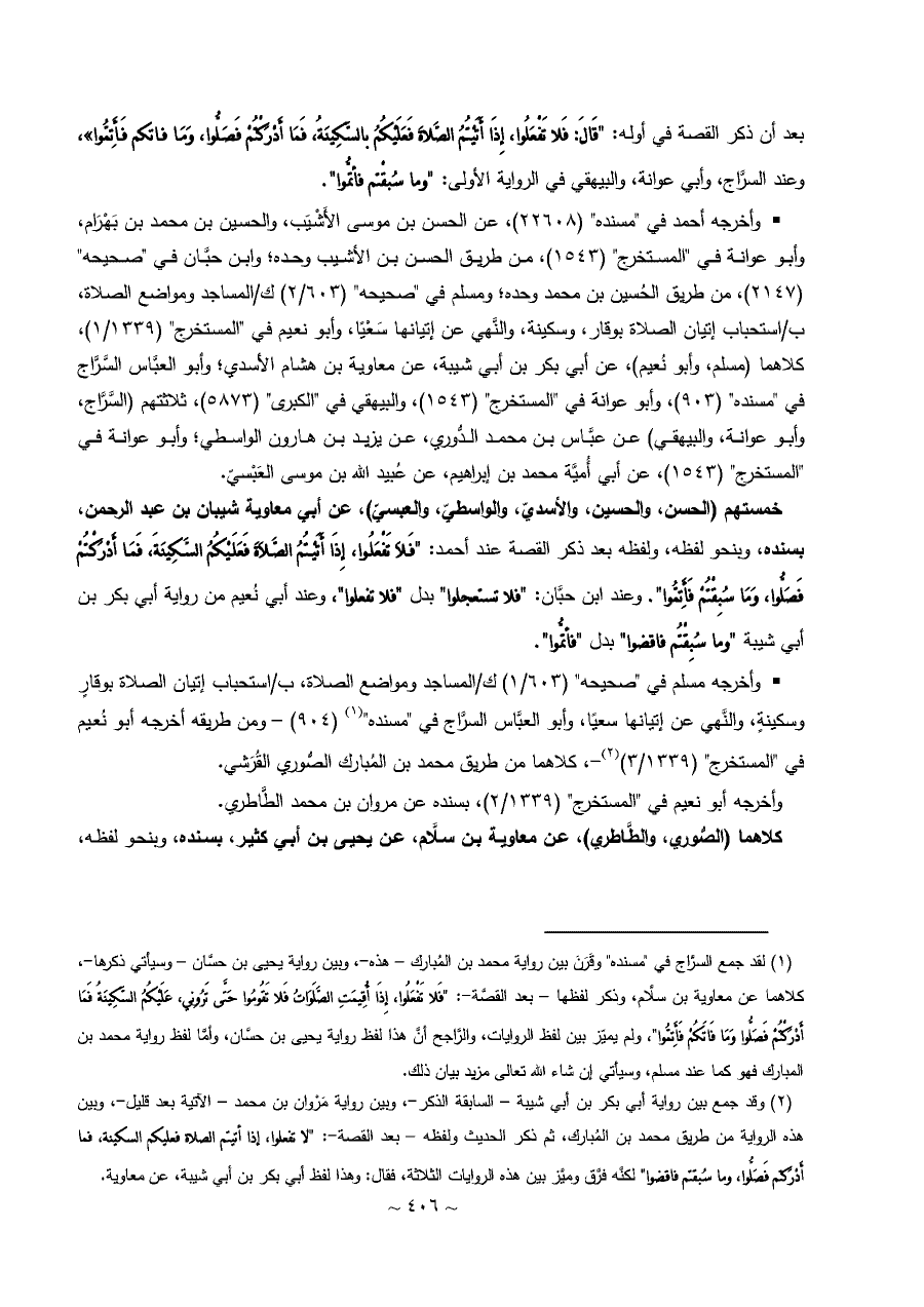 (¬١) لقد جمع السرَّاج في "مسنده" وقَرَنَ بين رواية محمد بن المُبارك - هذه -، وبين رواية يحيى بن حسَّان - وسيأتي ذكرها -، كلاهما عن معاوية بن سلَّام، وذكر لفظها - بعد القصَّة -: "فَلا تَفْعَلُوا، إِذَا أُقِيمَتِ الصَّلَوَاتُ فَلا تَقُومُوا حَتَّى تَرُونِي، عَلَيْكُمُ السَّكِينَةُ فَمَا أَدْرَكْتُمْ فَصَلُّوا وَمَا فَاتَكُمْ فَأَتِمُّوا"، ولم يميّز بين لفظ الروايات، والرَّاجح أنَّ هذا لفظ رواية يحيى بن حسَّان، وأمَّا لفظ رواية محمد بن المبارك فهو كما عند مسلم، وسيأتي إن شاء الله تعالى مزيد بيان ذلك.