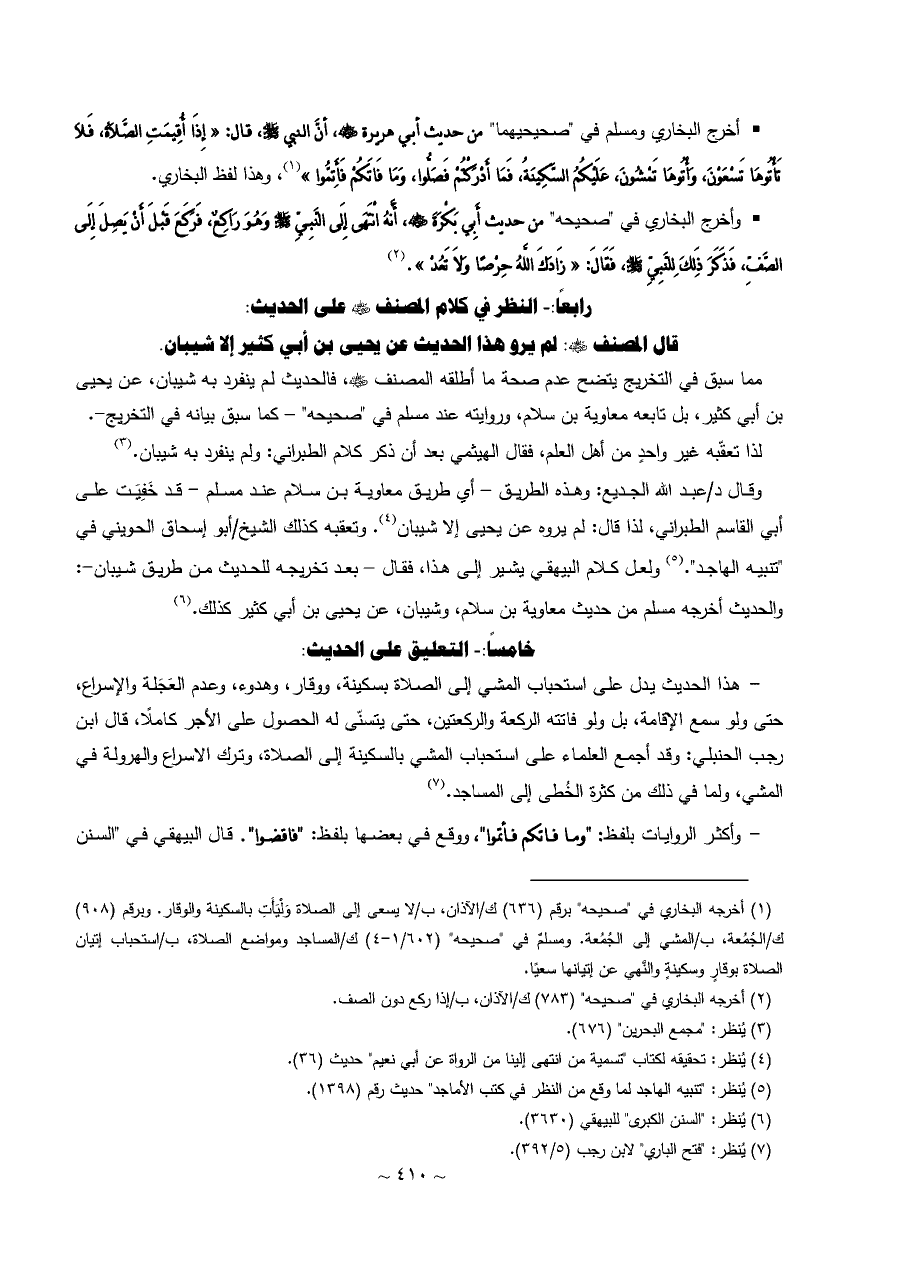 (¬١) أخرجه البخاري في "صحيحه" برقم (٦٣٦) ك/الآذان، ب/لا يسعى إلى الصلاة وَلْيَأَتِ بالسكينة والوقار. وبرقم (٩٠٨) ك/الجُمُعة، ب/المشي إلى الجُمُعة. ومسلمٌ في "صحيحه" (٦٠٢/ ١ - ٤) ك/المساجد ومواضع الصلاة، ب/استحباب إتيان الصلاة بوقارٍ وسكينةٍ والنَّهي عن إتيانها سعيًا.