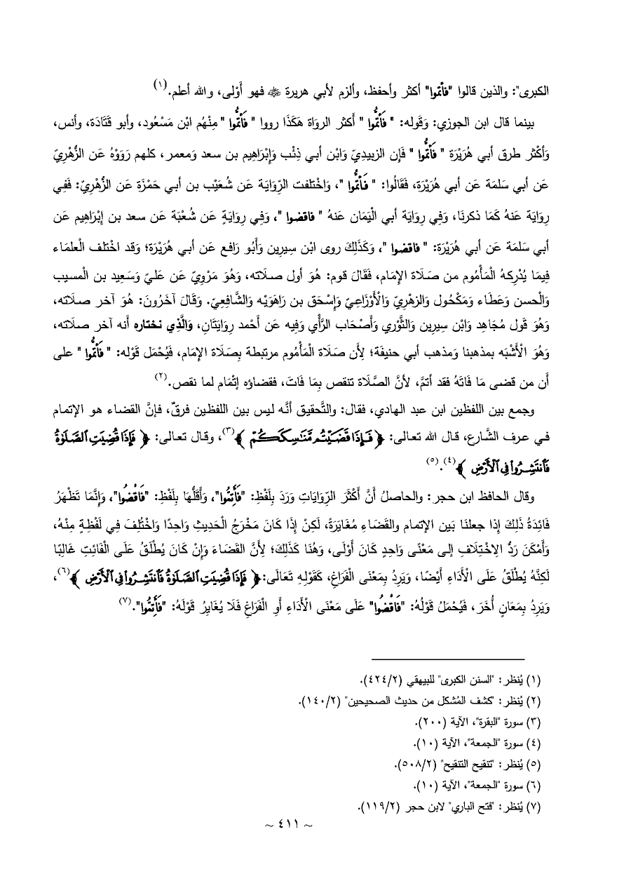 وقال الحافظ ابن حجر: والحاصلُ أَنَّ أَكْثَرَ الرِّوَايَاتِ وَرَدَ بِلَفْظِ: "فَأَتِمُّوا"، وَأَقَلُّهَا بِلَفْظِ: "فَاقْضُوا"، وَإِنَّمَا تَظْهَرُ فَائِدَةُ ذَلِكَ إِذا جعلنَا بَين الإتمام والقَضَاءِ مُغَايَرَةً، لَكِنْ إِذَا كَانَ مَخْرَجُ الْحَدِيثِ وَاحِدًا وَاخْتُلِفَ فِي لَفْظِةٍ مِنْهُ، وَأَمْكَنَ رَدُّ الِاخْتِلَافِ إلى مَعْنًى وَاحِدٍ كَانَ أَوْلَى، وَهُنَا كَذَلِكَ؛ لِأَنَّ القَضَاءَ وَإِنْ كَانَ يُطْلَقُ عَلَى الْفَائِتِ غَالِبًا لَكِنَّهُ يُطْلَقُ عَلَى الْأَدَاءِ أَيْضًا، وَيَرِدُ بِمَعْنَى الْفَرَاغِ، كَقَوْلِهِ تَعَالَى: {فَإِذَا قُضِيَتِ الصَّلَاةُ فَانْتَشِرُوا فِي الْأَرْضِ} (¬٦)، وَيَرِدُ بِمَعَانٍ أُخَرَ، فَيُحْمَلُ قَوْلُهُ: "فَاقْضُوا" عَلَى مَعْنَى الْأَدَاءِ أَوِ الْفَرَاغِ فَلَا يُغَايِرُ قَوْلَهُ: "فَأَتِمُّوا". (¬٧)
