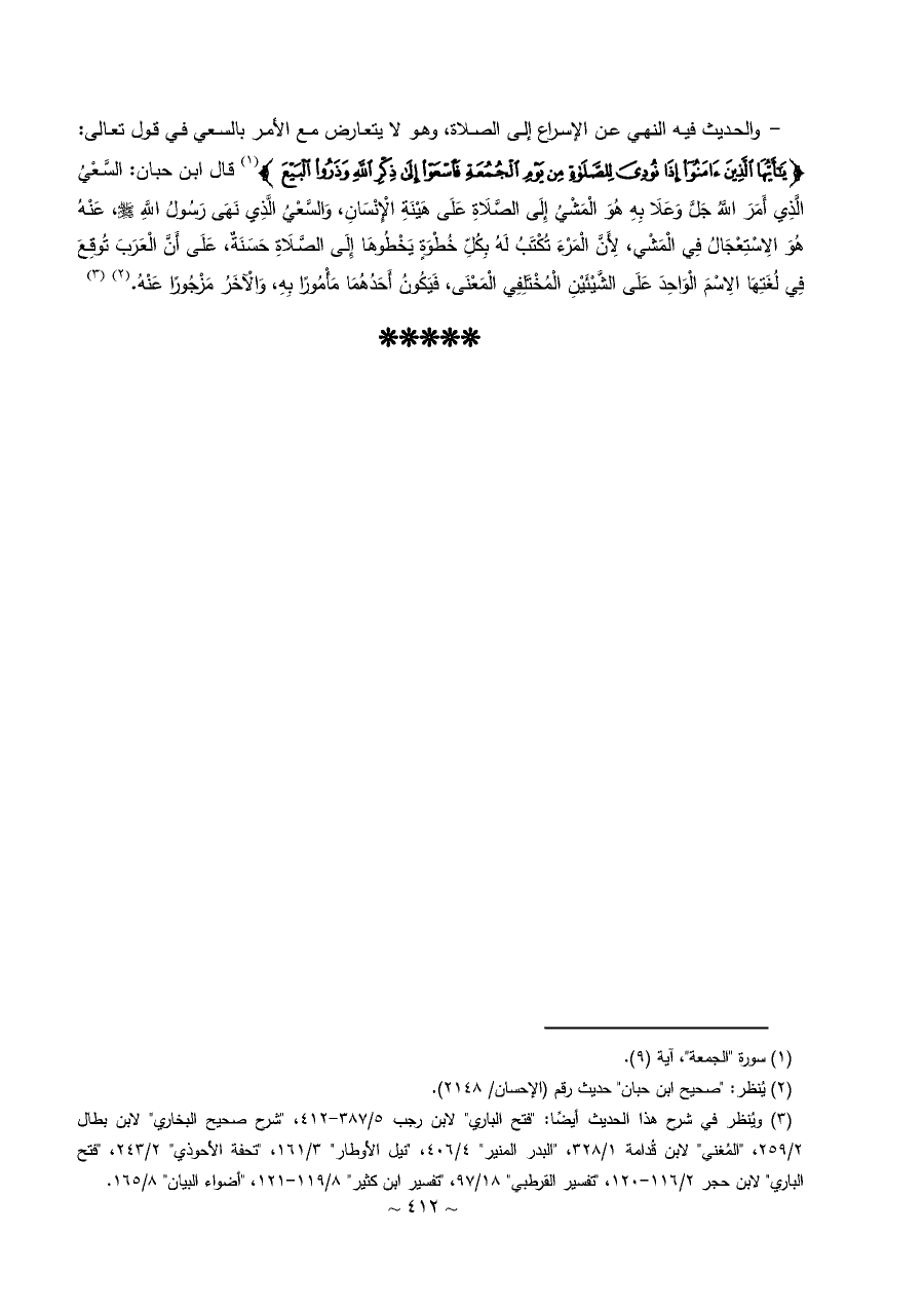 - والحديث فيه النهي عن الإسراع إلى الصلاة، وهو لا يتعارض مع الأمر بالسعي في قول تعالى: ... {يَاأَيُّهَا الَّذِينَ آمَنُوا إِذَا نُودِيَ لِلصَّلَاةِ مِنْ يَوْمِ الْجُمُعَةِ فَاسْعَوْا إِلَى ذِكْرِ اللَّهِ وَذَرُوا الْبَيْعَ} (¬١) قال ابن حبان: السَّعْيُ الَّذِي أَمَرَ اللَّهُ جَلَّ وَعَلَا بِهِ هُوَ الْمَشْيُ إِلَى الصَّلَاةِ عَلَى هَيْنَةِ الْإِنْسَانِ، وَالسَّعْيُ الَّذِي نَهَى رَسُولُ اللَّهِ - صلى الله عليه وسلم -، عَنْهُ هُوَ الِاسْتِعْجَالُ فِي الْمَشْي، لِأَنَّ الْمَرْءَ تُكْتَبُ لَهُ بِكُلِّ خُطْوَةٍ يَخْطُوهَا إِلَى الصَّلَاةِ حَسَنَةٌ، عَلَى أَنَّ الْعَرَبَ تُوقِعَ فِي لُغَتِهَا الِاسْمَ الْوَاحِدَ عَلَى الشَّيْئَيْنِ الْمُخْتَلِفِي الْمَعْنَى، فَيَكُونُ أَحَدُهُمَا مَأْمُورًا بِهِ، وَالْآخَرُ مَزْجُورًا عَنْهُ. (¬٢) (¬٣)