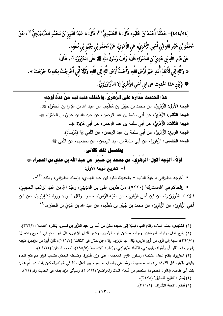 أولاً: - الوجه الأول: الزُّهْرِيُّ، عن محمد بن جُبَيْر، عن عبد الله بن عَدِيّ بن الحمراء - رضي الله عنه -.