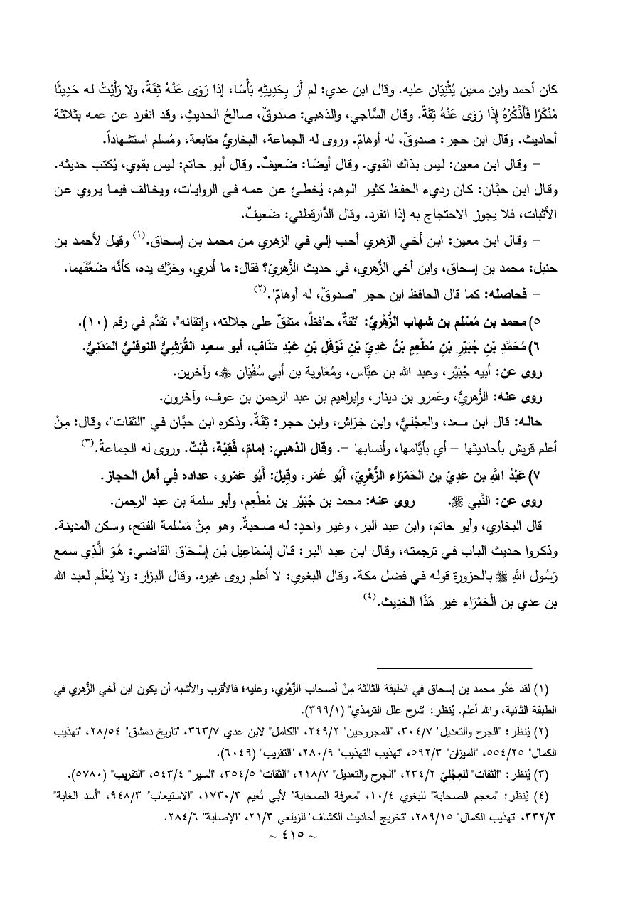 (¬١) لقد عَدُّو محمد بن إسحاق في الطبقة الثالثة مِنْ أصحاب الزُّهْري، وعليه؛ فالأقرب والأشبه أن يكون ابن أخي الزُّهري في الطبقة الثانية، والله أعلم. يُنظر: "شرح علل الترمذي" (١/ ٣٩٩).