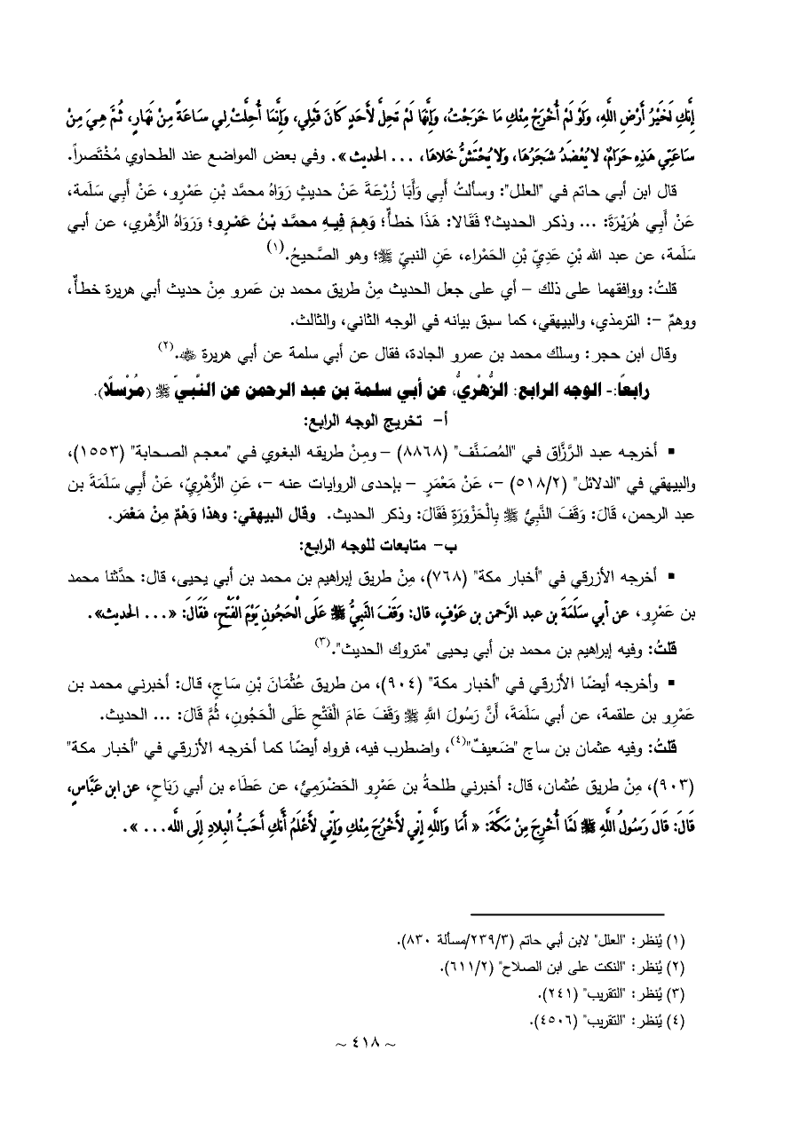 قال ابن أبي حاتم في "العلل": وسألتُ أَبِي وَأَبَا زُرْعَةَ عَنْ حديثٍ رَوَاهُ محمَّد بْنِ عَمْرٍو، عَنْ أَبِي سَلَمة، عَنْ أَبِي هُرَيْرَةَ: ... وذكر الحديث؟ فَقَالا: هَذَا خطأٌ؛ وَهِمَ فِيهِ محمَّد بْنُ عَمْرٍو؛ وَرَوَاهُ الزُّهْري، عن أبي سَلَمة، عن عبد الله بْنِ عَدِيِّ بْنِ الحَمْراء، عَنِ النبيِّ - صلى الله عليه وسلم -؛ وهو الصَّحيحُ. (¬١)