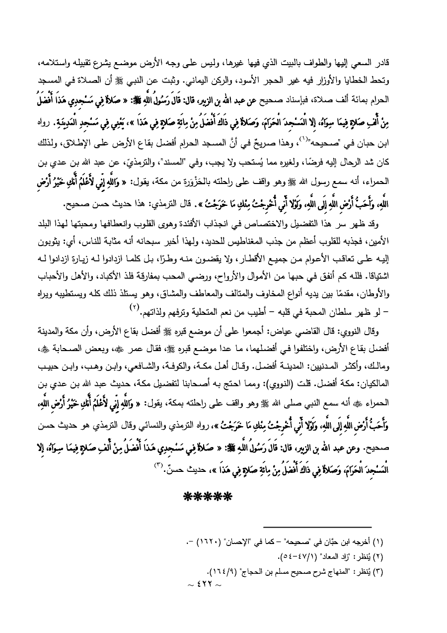 وقال النووي: قال القاضي عياض: أجمعوا على أن موضع قبره - صلى الله عليه وسلم - أفضل بقاع الأرض، وأن مكة والمدينة أفضل بقاع الأرض، واختلفوا في أفضلهما، ما عدا موضع قبره - صلى الله عليه وسلم -، فقال عمر - رضي الله عنه -، وبعض الصحابة - رضي الله عنهم -، ومالك، وأكثر المدنيين: المدينة أفضل. وقال أهل مكة، والكوفة، والشافعي، وابن وهب، وابن حبيب المالكيان: مكة أفضل. قلت (النووي): ومما احتج به أصحابنا لتفضيل مكة، حديث عبد الله بن عدي بن الحمراء - رضي الله عنه - أنه سمع النبي صلى الله - صلى الله عليه وسلم - وهو واقف على راحلته بمكة، يقول: «وَاللَّهِ إِنِّي لأَعْلَمُ أَنَّكِ خَيْرُ أَرْضِ اللَّهِ، وَأَحَبُّ أَرْضِ اللَّهِ إِلَى اللَّهِ، وَلَوْلا أَنِّي أُخْرِجْتُ مِنْكِ مَا خَرَجْتُ»، رواه الترمذي والنسائي وقال الترمذي هو حديث حسن صحيح. وعن عبد الله بن الزبير، قال: قَالَ رَسُولُ اللَّهِ - صلى الله عليه وسلم -: «صَلاةٌ فِي مَسْجِدِي هَذَا أَفْضَلُ مِنْ أَلْفِ صَلاةٍ فِيمَا سِوَاهُ، إِلا الْمَسْجِدَ الْحَرَامَ، وَصَلاةٌ فِي ذَاكَ أَفْضَلُ مِنْ مِائَةِ صَلاةٍ فِي هَذَا»، حديث حسنٌ. (¬٣)