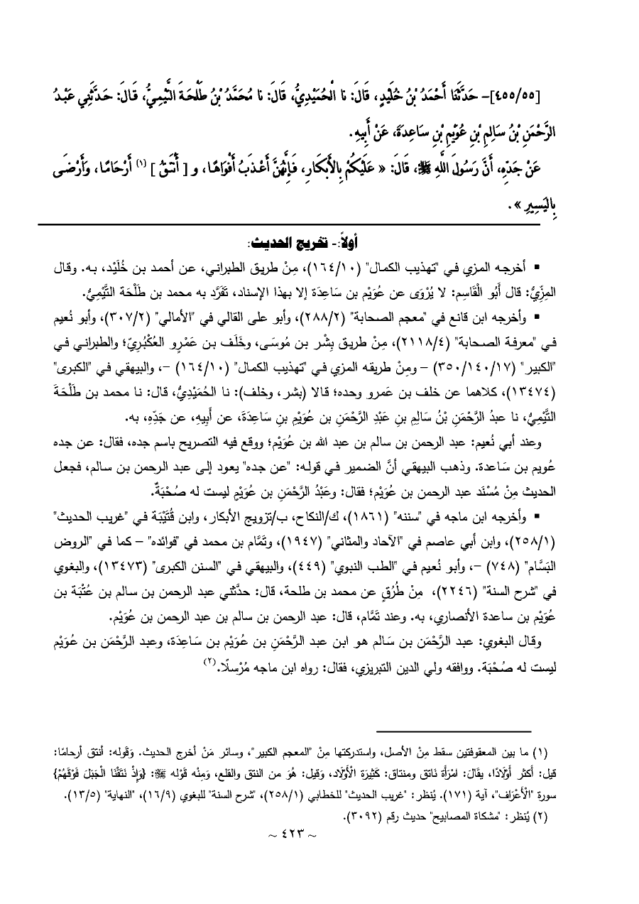[٥٥/ ٤٥٥]- حَدَّثَنَا أَحْمَدُ بْنُ خُلَيْدٍ، قَالَ: نا الْحُمَيْدِيُّ، قَالَ: نا مُحَمَّدُ بْنُ طَلْحَةَ التَّيْمِيُّ، قَالَ: حَدَّثَنِي عَبْدُ الرَّحْمَنِ بْنُ سَالِمِ بْنِ عُوَيْمِ بْنِ سَاعِدَةَ، عَنْ أَبِيهِ.