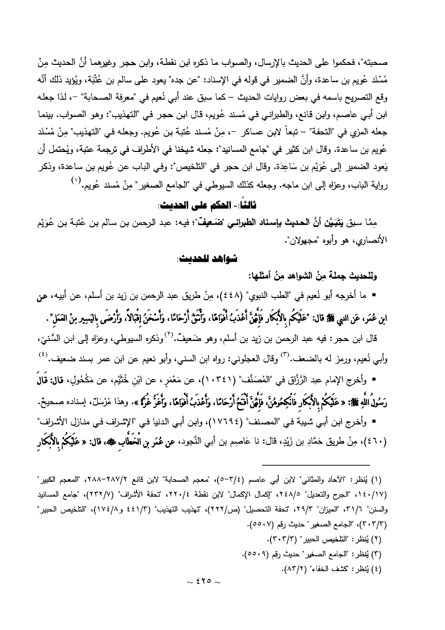 صحبته"، فحكموا على الحديث بالإرسال، والصواب ما ذكره ابن نقطة، وابن حجر وغيرهما أنَّ الحديث مِنْ مُسْنَد عُويم بن ساعدة، وأنَّ الضمير في قوله في الإسناد: "عن جده" يعود على سالم بن عُتْبَة، ويُؤيد ذلك أنَّه وقع التصريح باسمه في بعض روايات الحديث - كما سبق عند أبي نُعيم في "معرفة الصحابة" -، لذا جعله ابن أبي عاصم، وابن قانع، والطبراني في مُسند عُويم، قال ابن حجر في "التهذيب": وهو الصواب. بينما جعله المزي في "التحفة" - تبعاً لابن عساكر -، مِنْ مُسند عُتبة بن عُويم. وجعله في "التهذيب" مِنْ مُسْنَد عُويم بن ساعدة. وقال ابن كثير في "جامع المسانيد": جعله شيخنا في الأطراف في ترجمة عتبة، ويُحتمل أن يَعود الضمير إلى عُوَيْم بن سَاعِدَة. وقال ابن حجر في "التلخيص": وفي الباب عن عُويم بن ساعدة، وذكر رواية الباب، وعزاه إلى ابن ماجه. وجعله كذلك السيوطي في "الجامع الصغير" مِنْ مُسند عُويم. (¬١)