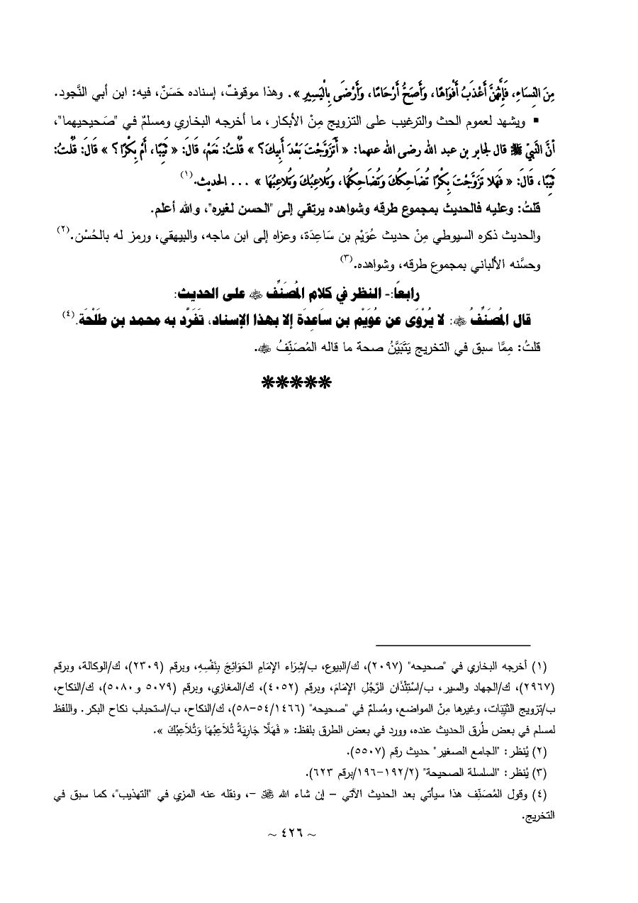 • ويشهد لعموم الحث والترغيب على التزويج مِنْ الأبكار، ما أخرجه البخاري ومسلمٌ في "صَحيحيهما"، أنَّ النَّبيّ - صلى الله عليه وسلم - قال لجابر بن عبد الله رضى الله عنهما: «أَتَزَوَّجْتَ بَعْدَ أَبِيكَ؟» قُلْتُ: نَعَمْ، قَالَ: «ثَيِّبًا، أَمْ بِكْرًا؟» قَالَ: قُلْتُ: ثَيِّبًا، قَالَ: «فَهَلا تَزَوَّجْتَ بِكْرًا تُضَاحِكُكَ وَتُضَاحِكُهَا، وَتُلاعِبُكَ وَتُلاعِبُهَا» ... الحديث. (¬١)