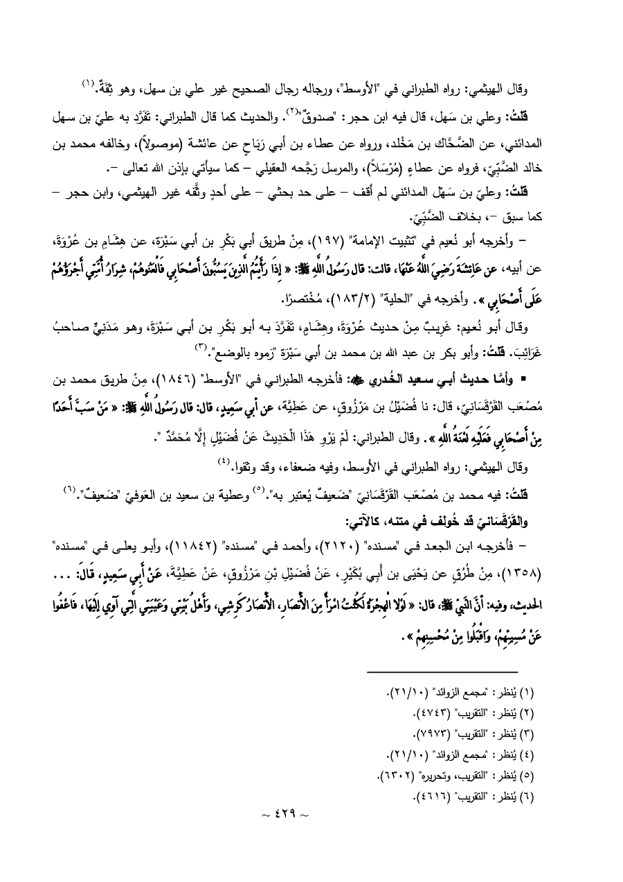 • وأمَّا حديث أبي سعيد الخُدري - رضي الله عنه -: فأخرجه الطبراني في "الأوسط" (١٨٤٦)، مِنْ طريق محمد بن مُصْعَب القَرْقَسَانِيّ، قال: نا فُضَيْلُ بن مَرْزُوقٍ، عن عَطِيَّة، عن أبي سَعِيدٍ، قال: قال رَسُولُ اللَّهِ - صلى الله عليه وسلم -: «مَنْ سَبَّ أَحَدًا مِنْ أَصْحَابِي فَعَلَيْهِ لَعْنَةُ اللَّهِ». وقال الطبراني: لَمْ يَرْوِ هَذَا الْحَدِيثَ عَنْ فُضَيْلٍ إِلَّا مُحَمَّدٌ ".