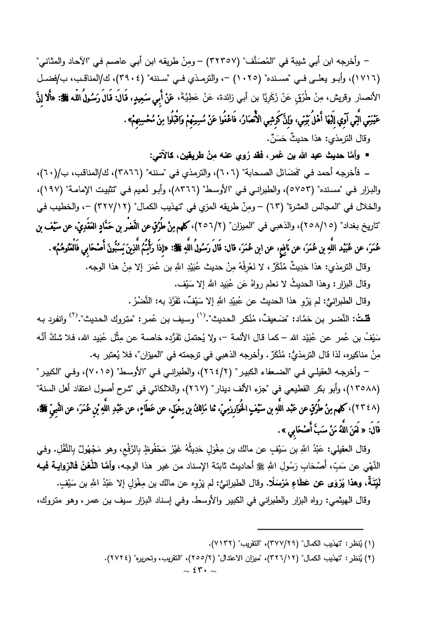 - فأخرجه أحمد في "فَضَائل الصحابة" (٦٠٦)، والترمذي في "سننه" (٣٨٦٦)، ك/المناقب، ب/ (٦٠)، والبزار في "مسنده" (٥٧٥٣)، والطبراني في "الأوسط" (٨٣٦٦)، وأبو نُعيم في "تثبيت الإمامة" (١٩٧)، والخلال في "المجالس العشرة" (٦٣) - ومِنْ طريقه المزي في "تهذيب الكمال" (١٢/ ٣٢٧) -، والخطيب في "تاريخ بغداد" (١٥/ ٢٥٨)، والذهبي في "الميزان" (٢/ ٢٥٦)، كلهم مِنْ طُرُقٍ عن النَّضْر بن حَمَّادٍ العَقَدِيّ، عن سَيْف بن عُمَرَ، عن عُبَيْد اللَّهِ بن عُمَرَ، عن نَافِعٍ، عن ابن عُمَرَ، قال: قَالَ رَسُولُ اللَّهِ - صلى الله عليه وسلم -: «إِذَا رَأَيْتُمُ الَّذِينَ يَسُبُّونَ أَصْحَابِي فَالْعَنُوهُمْ».