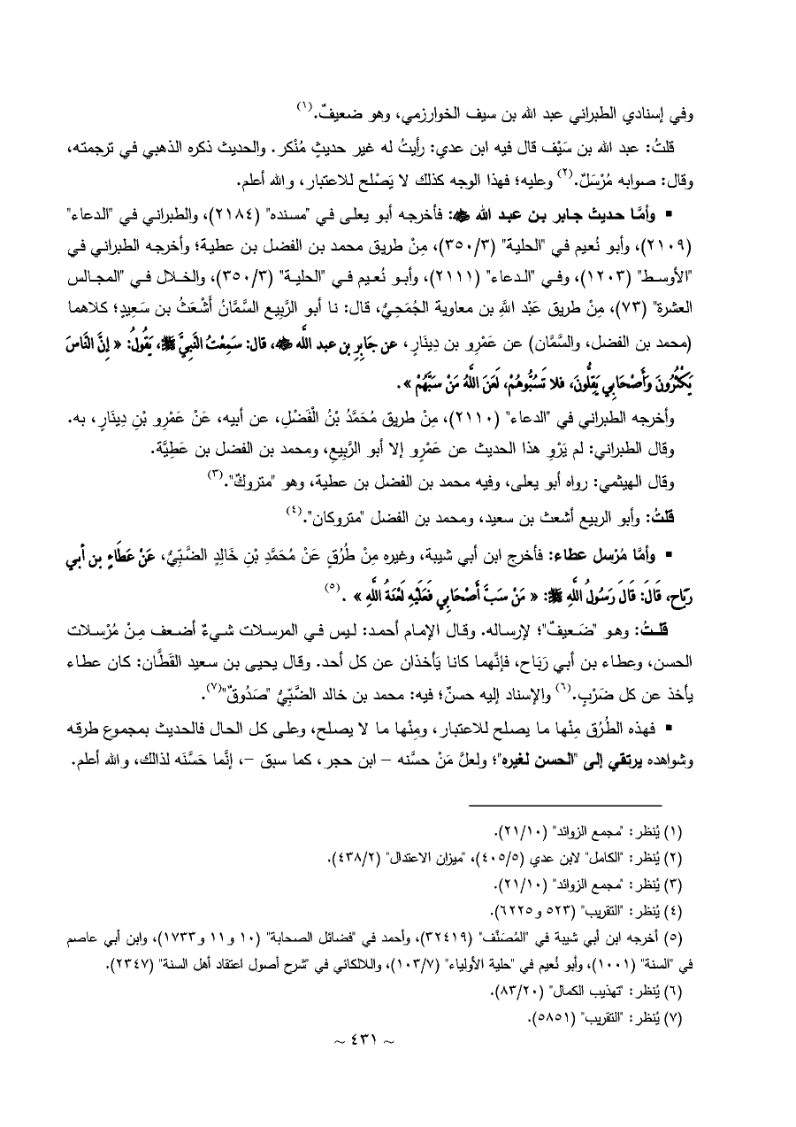 • وأمَّا حديث جابر بن عبد الله - رضي الله عنه -: فأخرجه أبو يعلى في "مسنده" (٢١٨٤)، والطبراني في "الدعاء" (٢١٠٩)، وأبو نُعيم في "الحلية" (٣/ ٣٥٠)، مِنْ طريق محمد بن الفضل بن عطية؛ وأخرجه الطبراني في "الأوسط" (١٢٠٣)، وفي "الدعاء" (٢١١١)، وأبو نُعيم في "الحلية" (٣/ ٣٥٠)، والخلال في "المجالس العشرة" (٧٣)، مِنْ طريق عَبْد اللَّهِ بن معاوية الجُمَحِيُّ، قال: نا أبو الرَّبِيع السَّمَّانُ أَشْعَثُ بن سَعِيدٍ؛ كلاهما (محمد بن الفضل، والسَّمَّان) عن عَمْرِو بن دِينَارٍ، عن جَابِرِ بن عبد اللَّه - رضي الله عنه -، قال: سَمِعْتُ النَّبِيَّ - صلى الله عليه وسلم -، يَقُولُ: «إِنَّ النَّاسَ يَكْثُرُونَ وَأَصْحَابِي يَقِلُّونَ، فلا تَسُبُّوهُمْ، لَعَنَ اللَّهُ مَنْ سَبَّهُمْ».