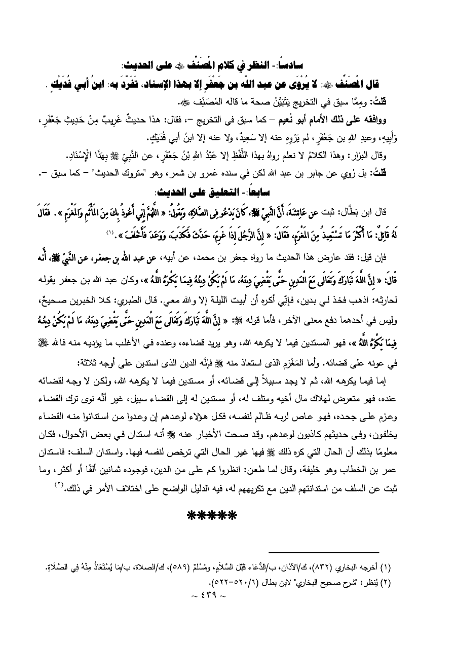 فإن قيل: فقد عارض هذا الحديث ما رواه جعفر بن محمد، عن أبيه، عن عبد الله بن جعفر، عن النَّبيّ - صلى الله عليه وسلم -، أنَّه قّالَ: «إِنَّ اللَّهَ تَبَارَكَ وَتَعَالَى مَعَ الْمَدِينِ حَتَّى يَقْضِيَ دِينَهُ، مَا لَمْ يَكُنْ دِينُهُ فِيمَا يَكْرَهُ اللَّهُ»، وكان عبد الله بن جعفر يقوله لحارثه: اذهب فخذ لي بدين، فإنِّي أكره أن أبيت الليلة إلا والله معي. قال الطبري: كلا الخبرين صحيحٌ، وليس في أحدهما دفع معنى الآخر، فأما قوله - صلى الله عليه وسلم -: «إِنَّ اللَّهَ تَبَارَكَ وَتَعَالَى مَعَ الْمَدِينِ حَتَّى يَقْضِيَ دِينَهُ، مَا لَمْ يَكُنْ دِينُهُ فِيمَا يَكْرَهُ اللَّهُ»، فهو المستدين فيما لا يكرهه الله، وهو يريد قضاءه، وعنده في الأغلب ما يؤديه منه فالله - جل جلاله - في عونه على قضائه. وأما المَغْرَم الذى استعاذ منه - صلى الله عليه وسلم - فإنَّه الدين الذى استدين على أوجه ثلاثة: