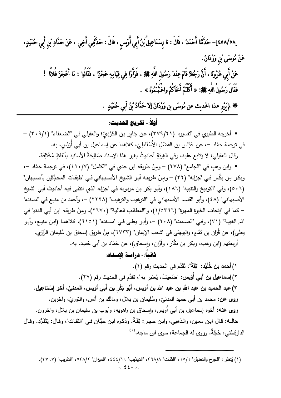 [٥٨/ ٤٥٨]- حَدَّثَنَا أَحْمَدُ، قَالَ: نا إِسْمَاعِيلُ بْنُ أَبِي أُوَيْسٍ، قَالَ: حَدَّثَنِي أَخِي، عَنْ حَمَّادِ بْنِ أَبِي حُمَيْدٍ، عَنْ مُوسَى بْنِ وَرْدَانَ.