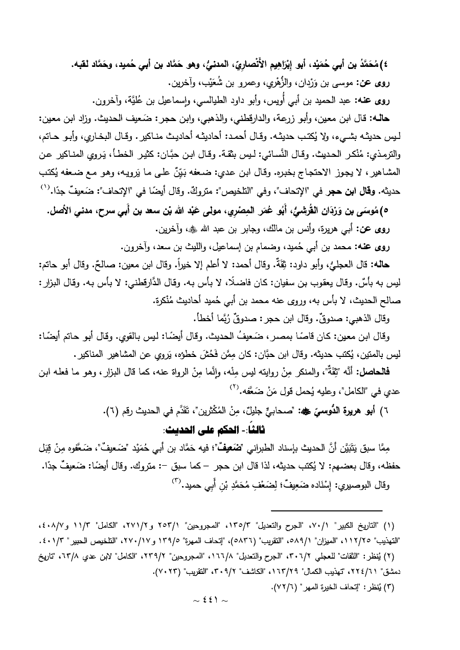 ٤) مُحَمَّدُ بن أبي حُمَيْد، أبو إِبْرَاهِيم الأَنْصارِيّ، المدنيُّ، وهو حَمَّاد بن أبي حُميد، وحَمَّاد لقبه.