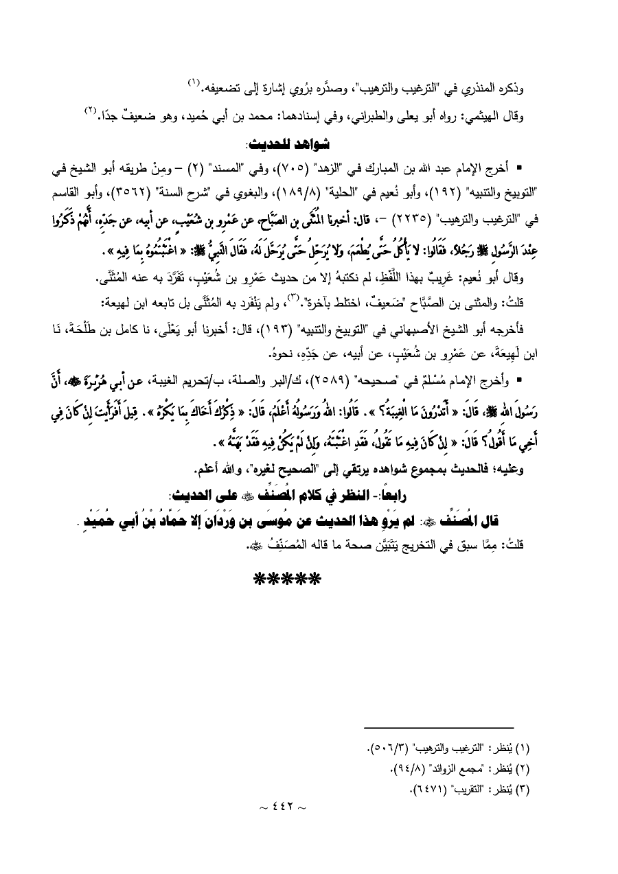 • أخرج الإمام عبد الله بن المبارك في "الزهد" (٧٠٥)، وفي "المسند" (٢) - ومِنْ طريقه أبو الشيخ في "التوبيخ والتنبيه" (١٩٢)، وأبو نُعيم في "الحلية" (٨/ ١٨٩)، والبغوي في "شرح السنة" (٣٥٦٢)، وأبو القاسم في "الترغيب والترهيب" (٢٢٣٥) -، قال: أخبرنا المُثَنَّى بن الصَبَّاح، عن عَمْرِو بن شُعَيْبٍ، عن أبيه، عن جَدِّهِ، أَنَّهُمْ ذَكَرُوا عِنْدَ الرَّسُولِ - صلى الله عليه وسلم - رَجُلاً، فَقَالُوا: لا يَأْكُلُ حَتَّى يُطْعَمَ، وَلا يُرَحِّلُ حَتَّى يُرَحَّلَ لَهُ، فَقَالَ النَّبِيُّ - صلى الله عليه وسلم -: «اغْتَبْتُمُوهُ بِمَا فِيهِ».