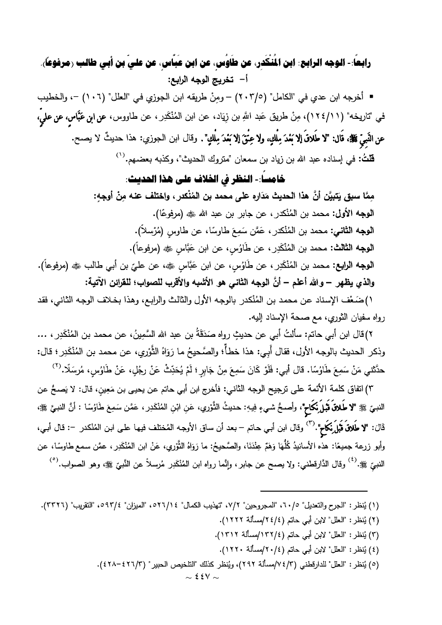 ٣) اتفاق كلمة الأئمة على ترجيح الوجه الثاني: فأخرج ابن أبي حاتم عن يحيى بن مَعِينٍ، قال: لا يَصحُّ عن النبيّ - صلى الله عليه وسلم - "لا طَلاقَ قَبْلَ نِكَاحٍ"، وأصحُّ شيءٍ فِيهِ: حديثُ الثَّوْري، عَنِ ابْنِ المُنْكَدِر، عَمَّن سَمِعَ طَاوُسًا: أنَّ النبيَّ - صلى الله عليه وسلم -، قَالَ: "لا طَلاقَ قَبْلَ نِكَاحٍ". (¬٣) وقال ابن أبي حاتم - بعد أن ساق الأوجه المُختلف فيها على ابن المُنْكدر -: قال أبي، وأبو زرعة جميعًا: هذه الأسانيدُ كُلُّهَا وَهَمٌ عِنْدَنَا، والصَّحيحُ: ما رَوَاهُ الثَّوْري، عَنْ ابن المُنْكَدِر، عمَّن سمع طاوسًا، عن النبيِّ - صلى الله عليه وسلم -. (¬٤) وقال الدَّارقطني: ولا يصح عن جابر، وإنَّما رواه ابن المُنْكَدِر مُرسلاً عن النَّبيّ - صلى الله عليه وسلم -، وهو الصواب. (¬٥)